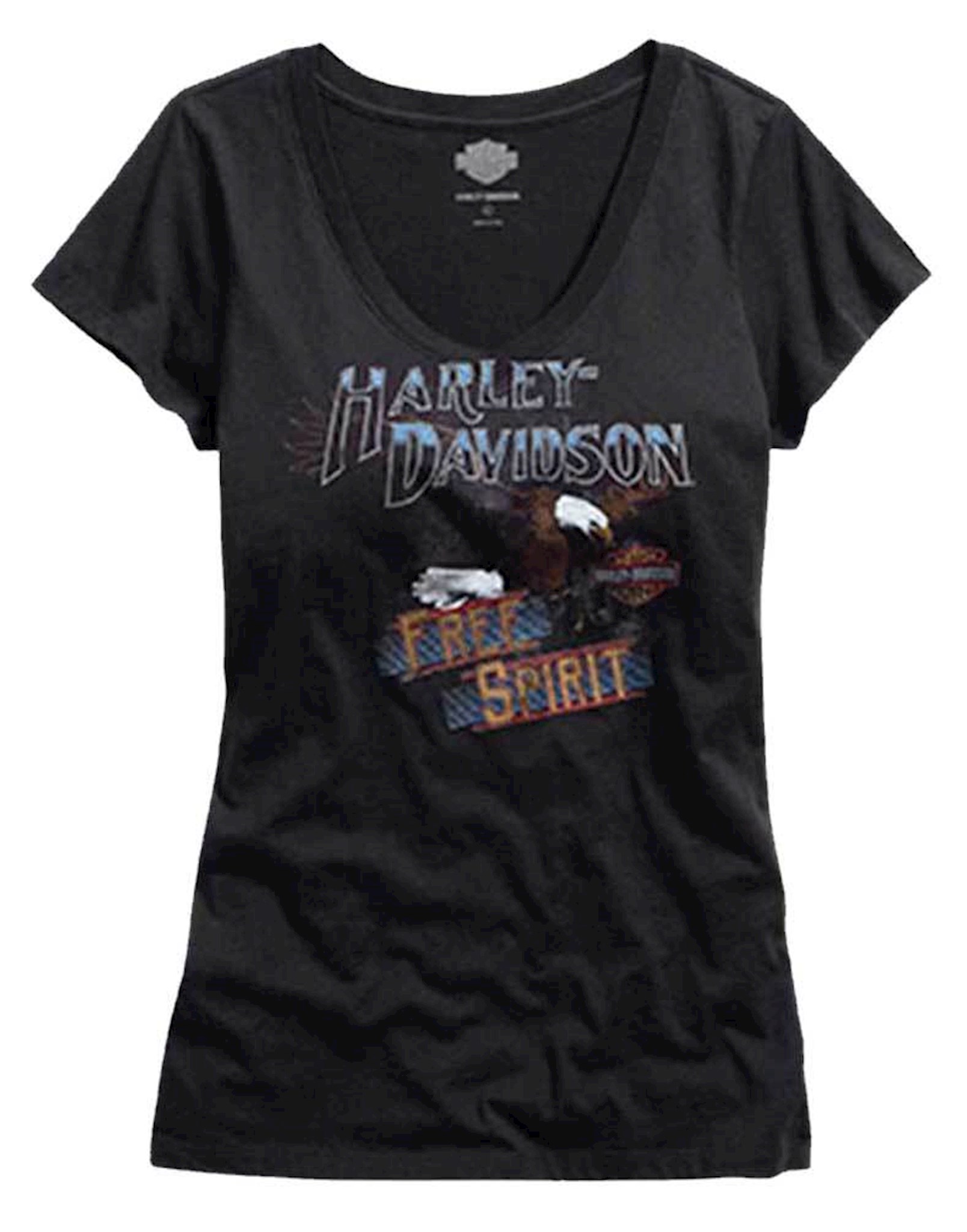 Harley-Davidson® Women's Free Spirit Eagle V-Neck Tee T-Shirt, Black. 96329-16VW. Non-conformist? Independent attitude? Wild at heart? Express yourself in the Free Spirit V-Neck Tee. For total comfort and easy care, this women's short sleeve top is styled from all-cotton jersey. Slim fit - designed to fit closer to the chest and waist. For a roomier fit, size up. 100% cotton jersey. Rib-knit neckline. Distressed printed graphics on front. Color: Black.