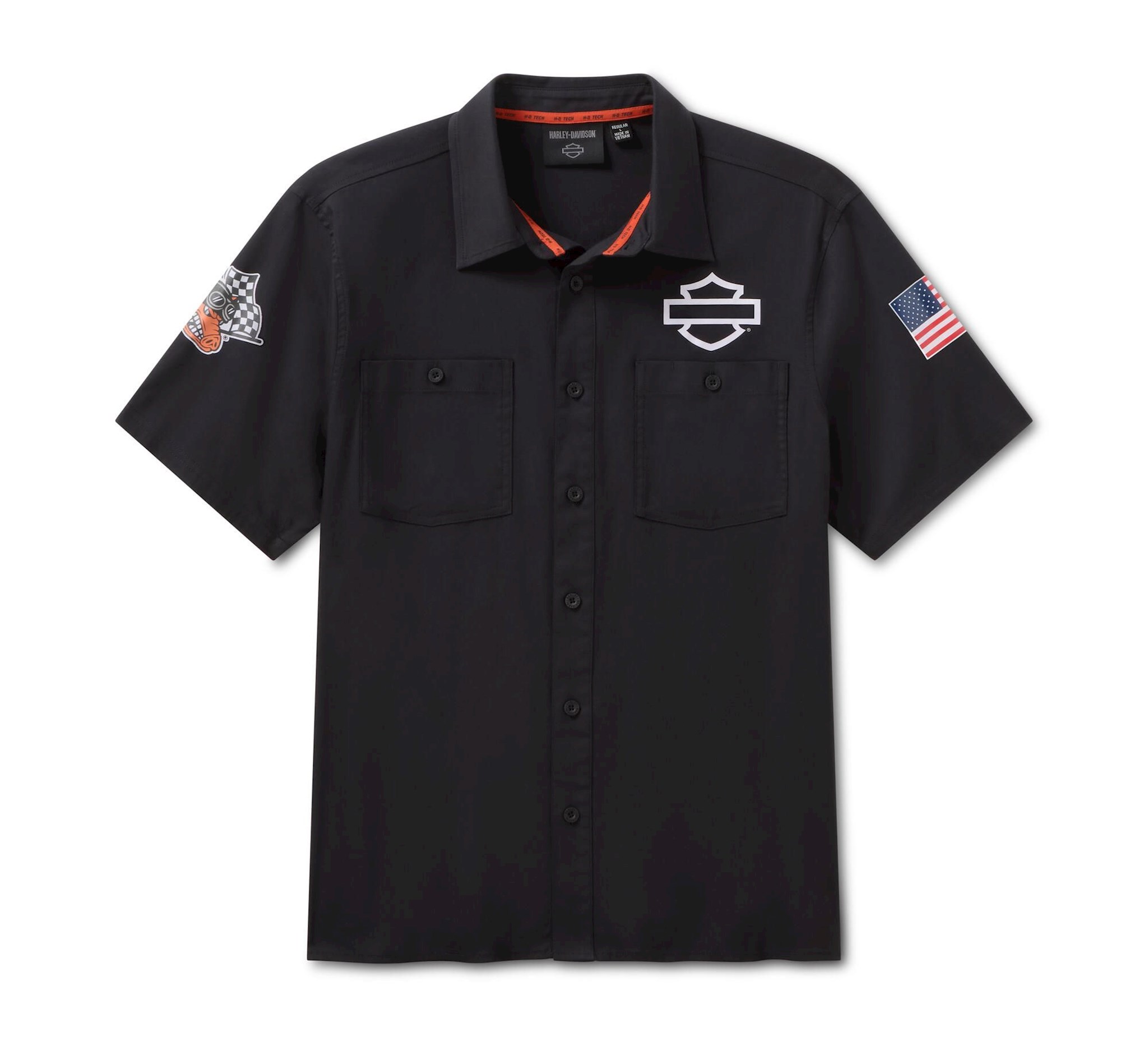 Made from 100% cotton twill that’s never stiff or constricting because it’s pre-washed for a lived-in feel at mile marker 1. Branded with our most iconic logo in an embroidered appliqué for an understated, authentic H-D® look. Materials: 100% cotton twill, washed for softness. Closure: Button front. Pockets: Button flap chest pockets. Design Details: Slightly shorter and roomier mechanic silhouette. Hidden snap-down collar. Adjustable cuffs. Graphics: Embroidered appliqué.