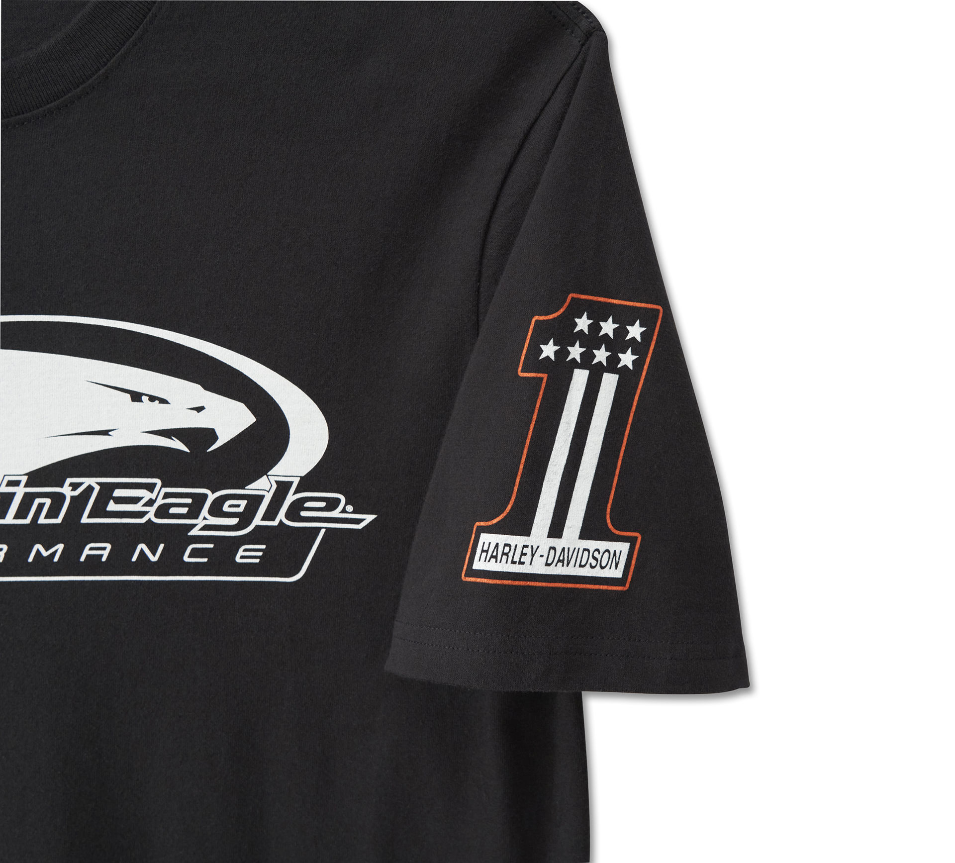 Sporty style is retooled for bagger racing fans on the Screamin' Eagle Short Sleeve Tee. Made from ring-spun cotton jersey for breathable comfort in a relaxed fit. Finished with back piping and a bold mix of graphics that applaud winning performance, including our #1 Logo on one sleeve. Know the history—our #1 Logo debuted in 1969 to honor our AMA Grand National Championship title that year.