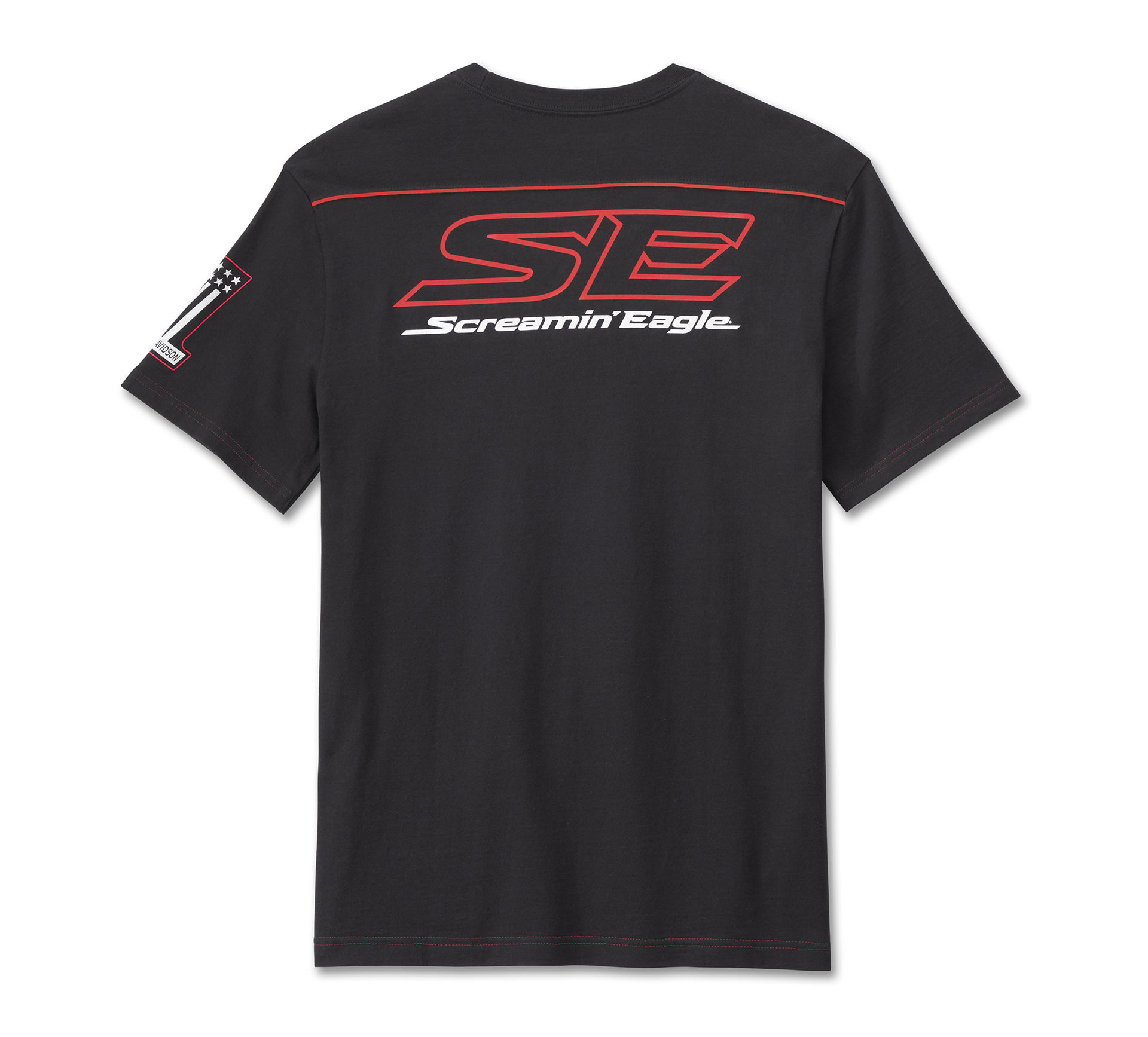 Sporty style is retooled for bagger racing fans on the Screamin' Eagle Short Sleeve Tee. Made from ring-spun cotton jersey for breathable comfort in a relaxed fit. Finished with back piping and a bold mix of graphics that applaud winning performance, including our #1 Logo on one sleeve. Know the history—our #1 Logo debuted in 1969 to honor our AMA Grand National Championship title that year.