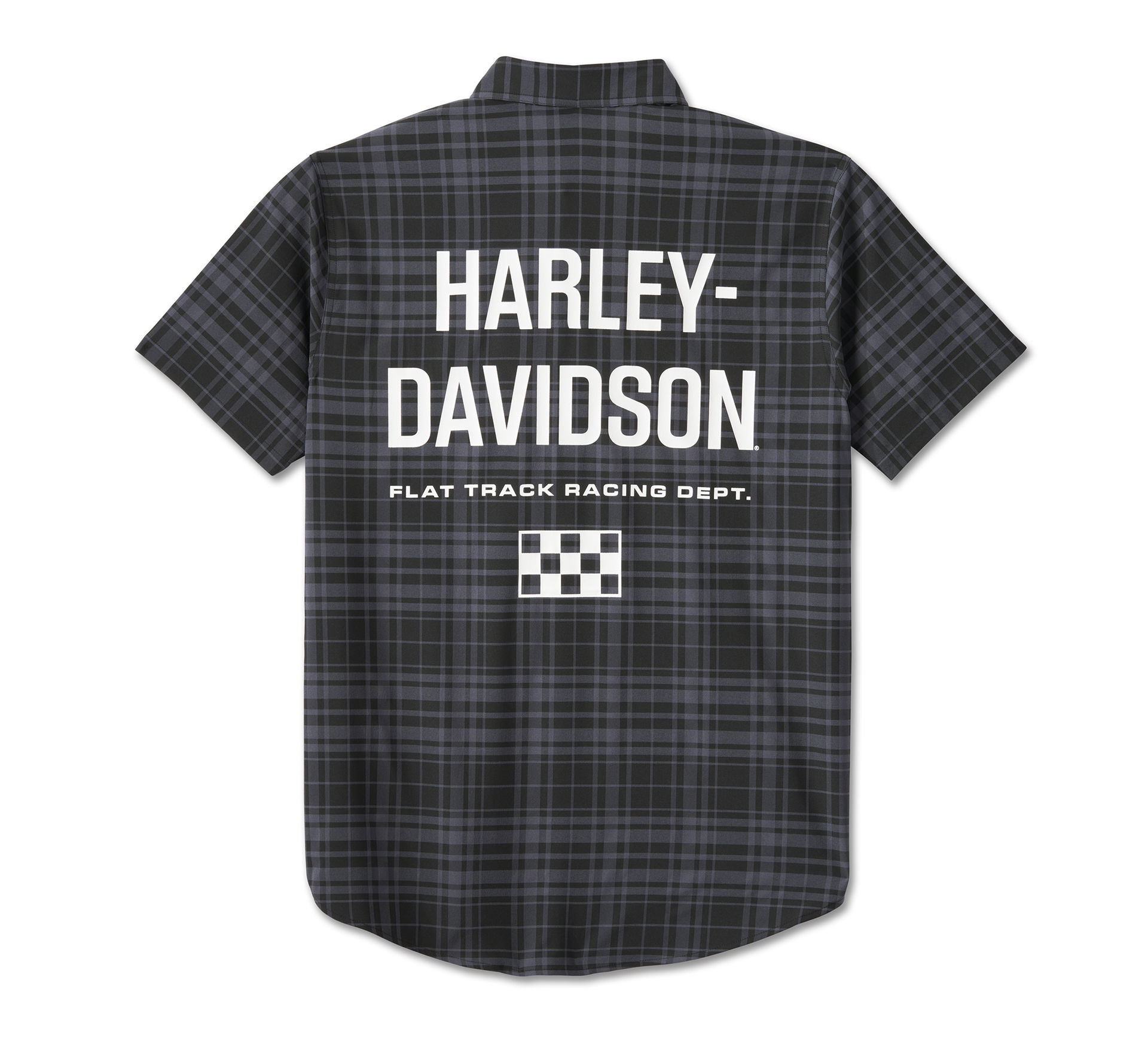 From long riding days to long working hours, the Enduro Short Sleeve Performance Plaid Shirt keeps pace with you. Made from a blend of moisture-wicking and anti-microbial materials to help you stay cool, not clammy. This men’s button down has a relaxed fit and features a hidden snap-down collar that won’t flap around under your riding gear. It earns style points for the patch on front and print on back of special seasonal graphics that applaud our flat track racing history.
