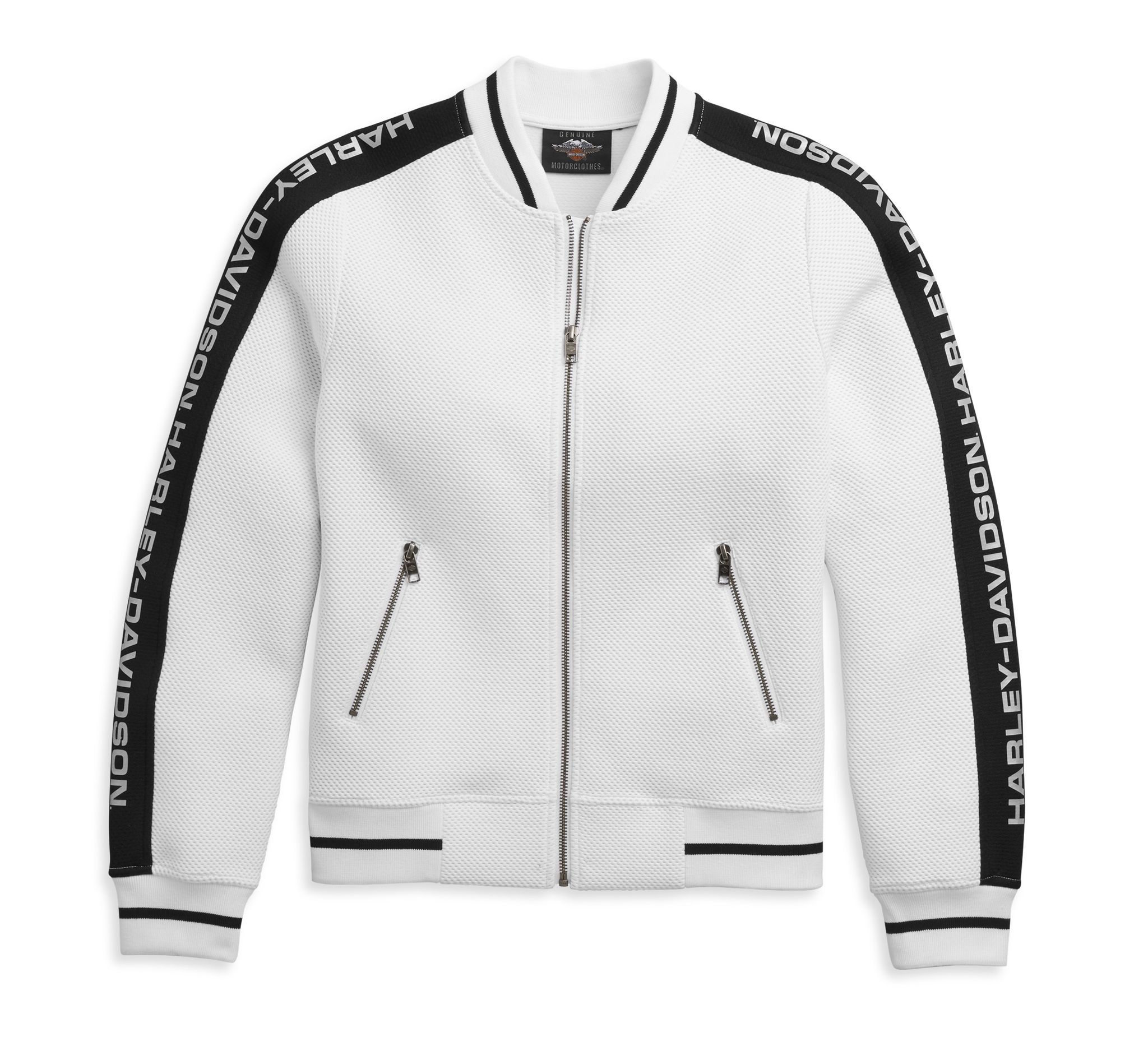 Harley-Davidson® Women's Sleeve Logo Active Jacket - Bright White, 96486-21VW. Made from 70% cotton, 26% polyester and 4% spandex jacquard. Zip closure and hand warmer pocket with branded pulls. Wind flap zipper guard and rib collar, cuffs and hem. Reflective printed graphics down sleeves. Wrinkle-resistant and ready to wear.