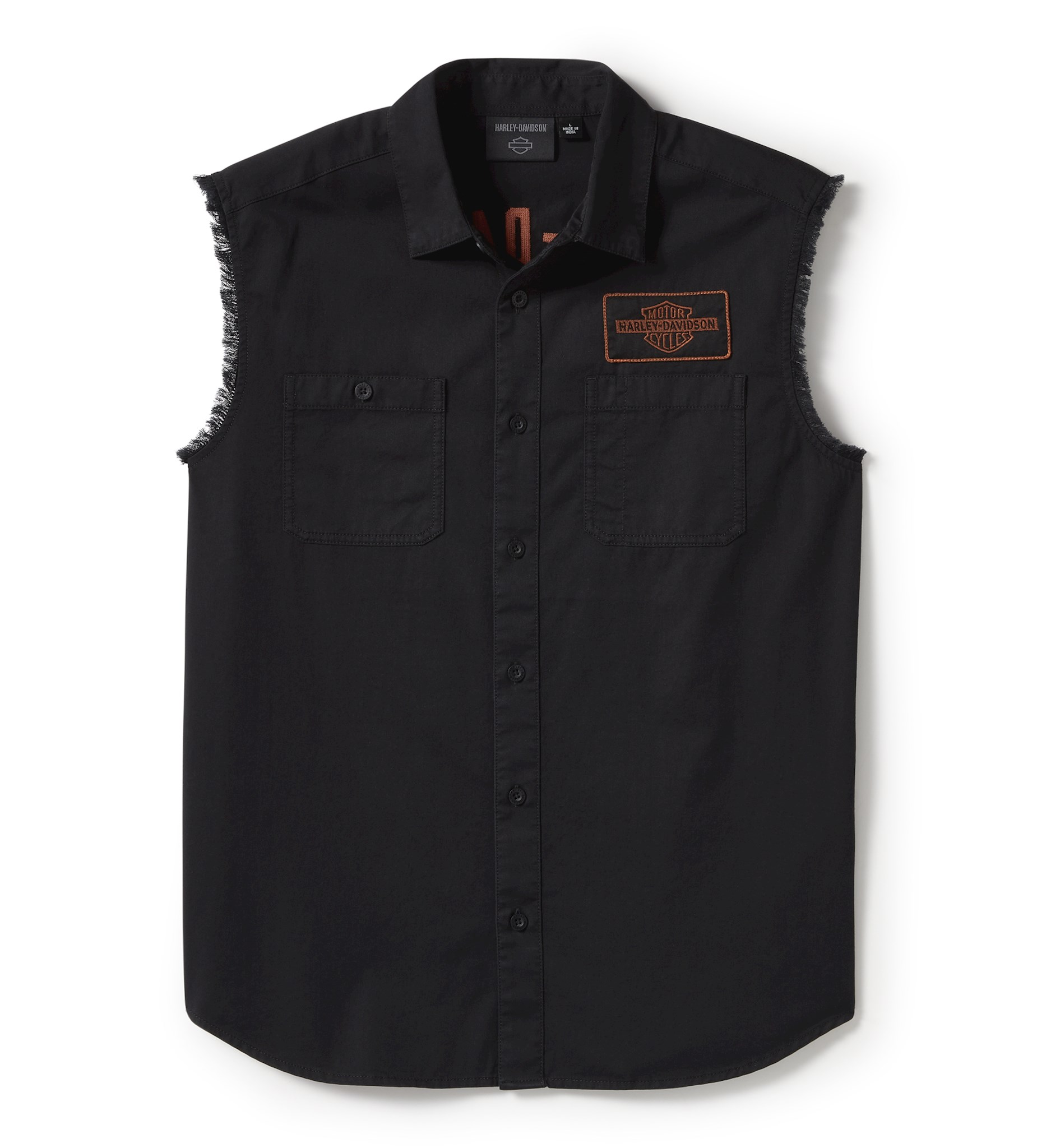 Vintage style rules on our V-Twin Equipped Solid Blowout. Made rugged yet breathable and lightweight from cotton twill that’s washed for softness and a worn-in vibe. This men’s sleeveless button down shirt features a pen stall pocket, armhole fringe and branded buttons for added style and comfort, plus a hidden snap-down collar that stays put under riding gear. The front embroidered patch mimics our 1930s Bar & Shield, while the back goes all-in with chainstitch graphics inspired by our archives.