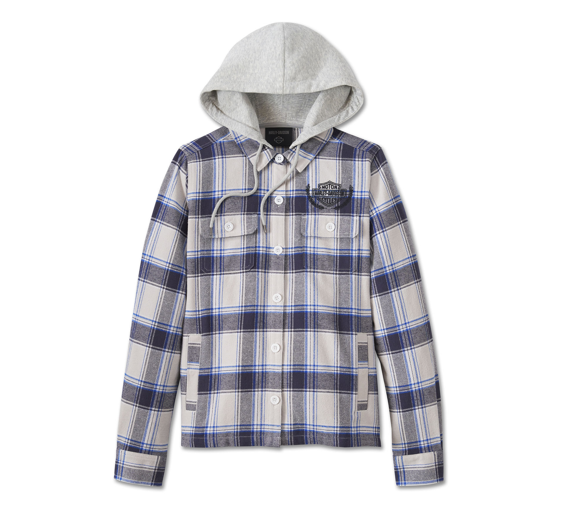 Plaid krijgt een race-geïnspireerde upgrade op ons Harley Heritage Classic Shirt Jacket. Dit flanellen shirtjack met capuchon voor vrouwen is gemaakt van zware geborstelde katoenen keperstof. Het heeft een afneembare capuchon die eraf kan worden geritst, handverwarmende zakken die kunnen worden dichtgeklikt en een kraag met verborgen drukknopen die niet onder je motorkleding wappert. Het frisse ruitpatroon past goed bij de geborduurde seizoensgraphics die onze trotse racegeschiedenis eren.