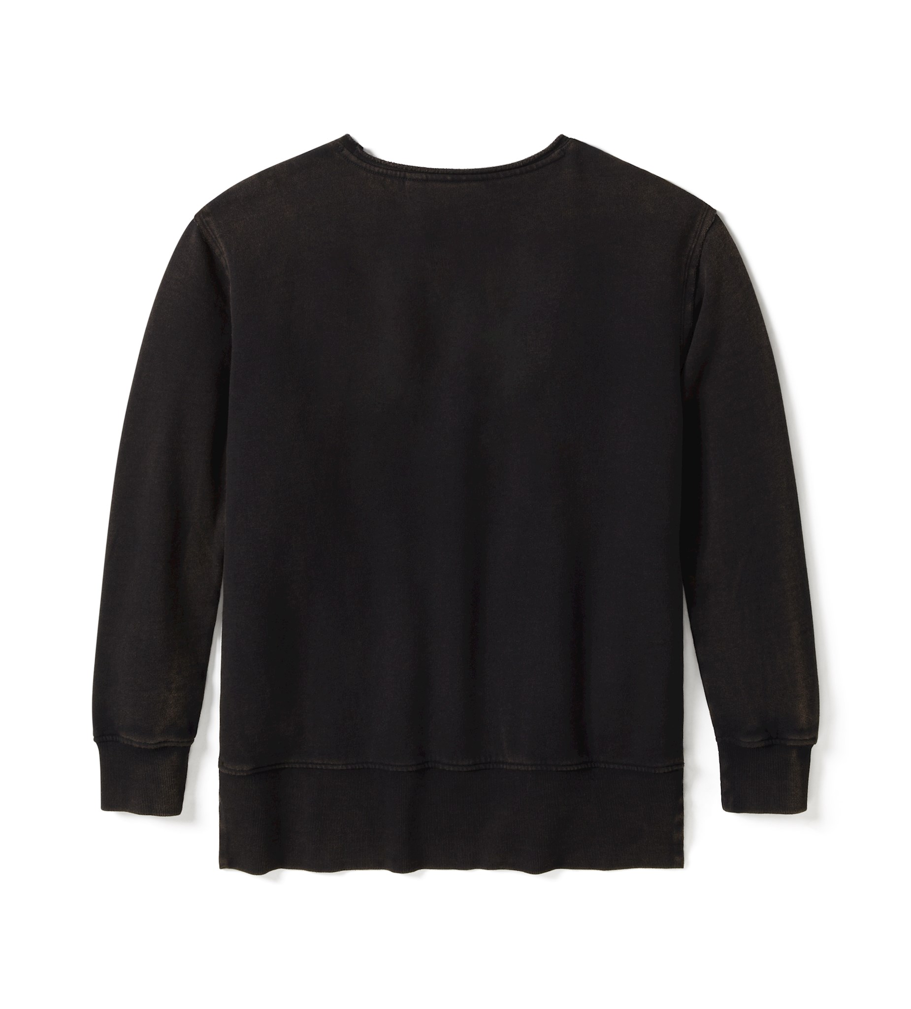77% cotton, 23% polyester midweight french terry, heavy acid washed. Longer fit, Wider neckline with rib-knit V insert. Drop shoulder. Soft-hand distressed print.