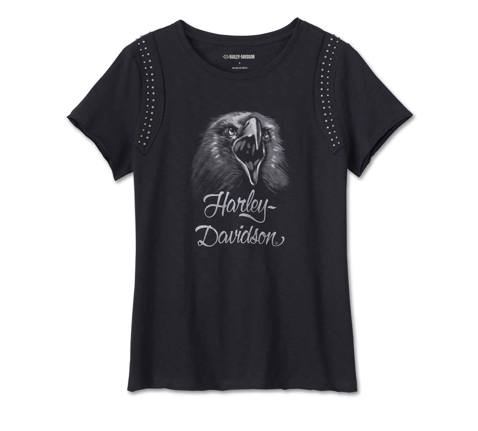 Retro, raw-edge stijl vind je op deze Limited Issue. Ons Monument Valley Embellished T-shirt is gemaakt van katoenen negatieve slubjersey die is gewassen voor zachtheid en een versleten vibe. Het tilt je look naar een hoger niveau met flatterende kenmerken zoals een ronde halslijn, details met onafgewerkte randen en verfraaiing met studs. Onze graphics in grijstinten schreeuwen aan de voorkant, voor een afwerking die gedurfd en prachtig Harley-Davidson is. Bestel nu: de voorraad is beperkt.