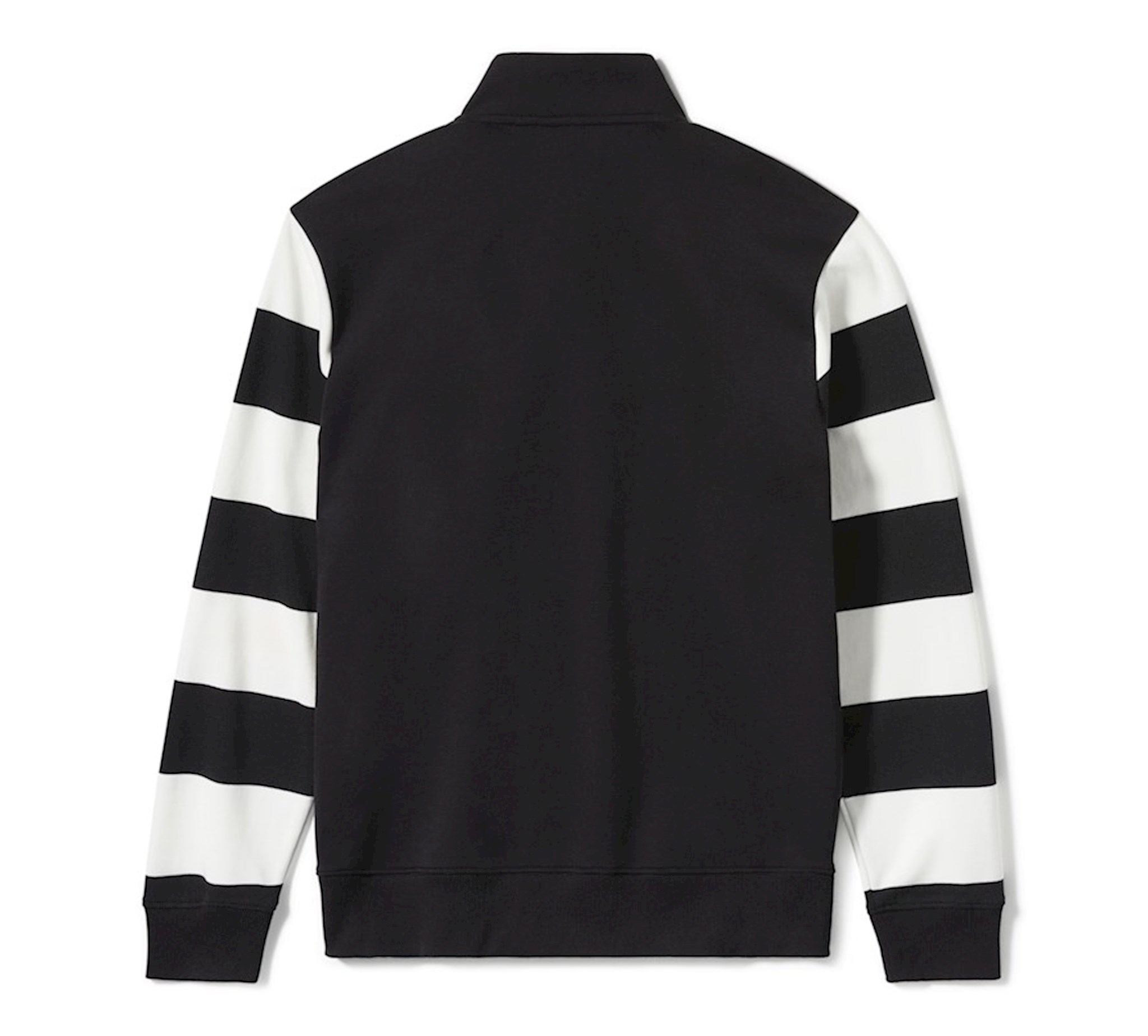 Materialen: 55% katoen, 45% polyester zwaargewicht interlock. Sluiting: Kwart-rits pullover. Ontwerpdetails: Garengeverfde mouwstriping. Ribgebreide manchetten en zoom. Graphics: Vilten applicatie met zigzagsteek rand.