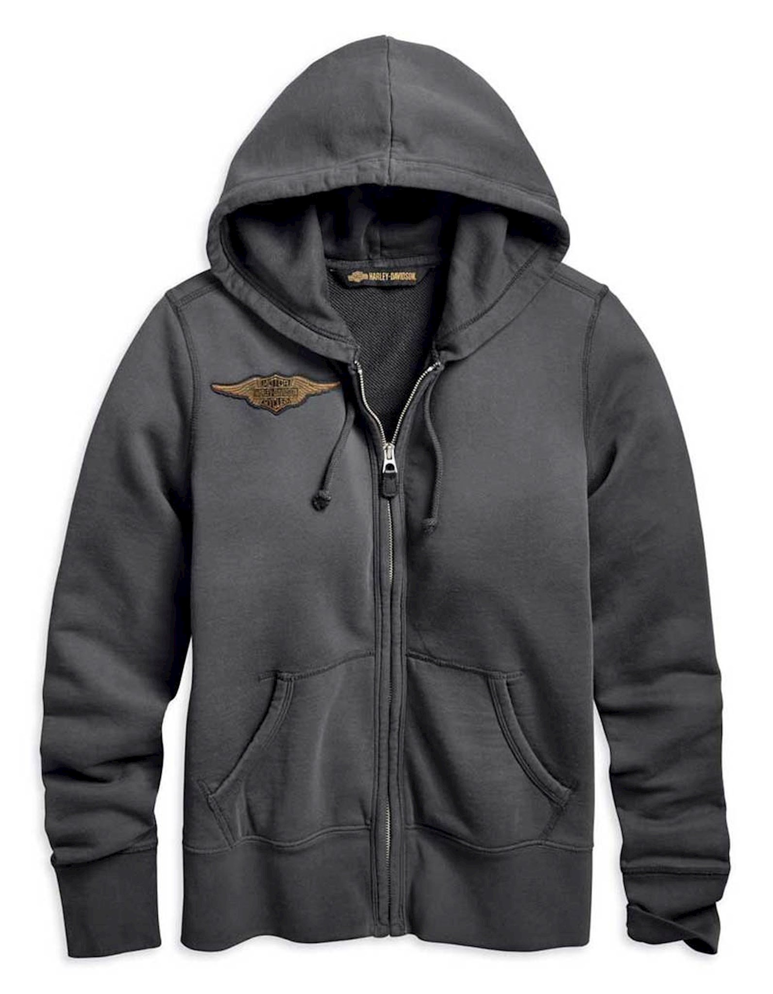 Harley-Davidson® Women's Double Layer Felt Letter Hoodie. Made from 100% cotton French terry. Washed for softness. Garment dyed with pigment spray for washed-down look. Rib-knit cuffs and waist. Lined drawstring hood. Zipper front. Kangaroo-style pockets. Embroidered patch. Dirty two-layer felt applique lettering