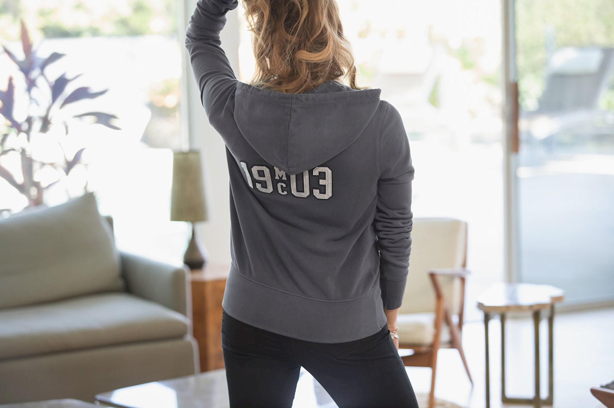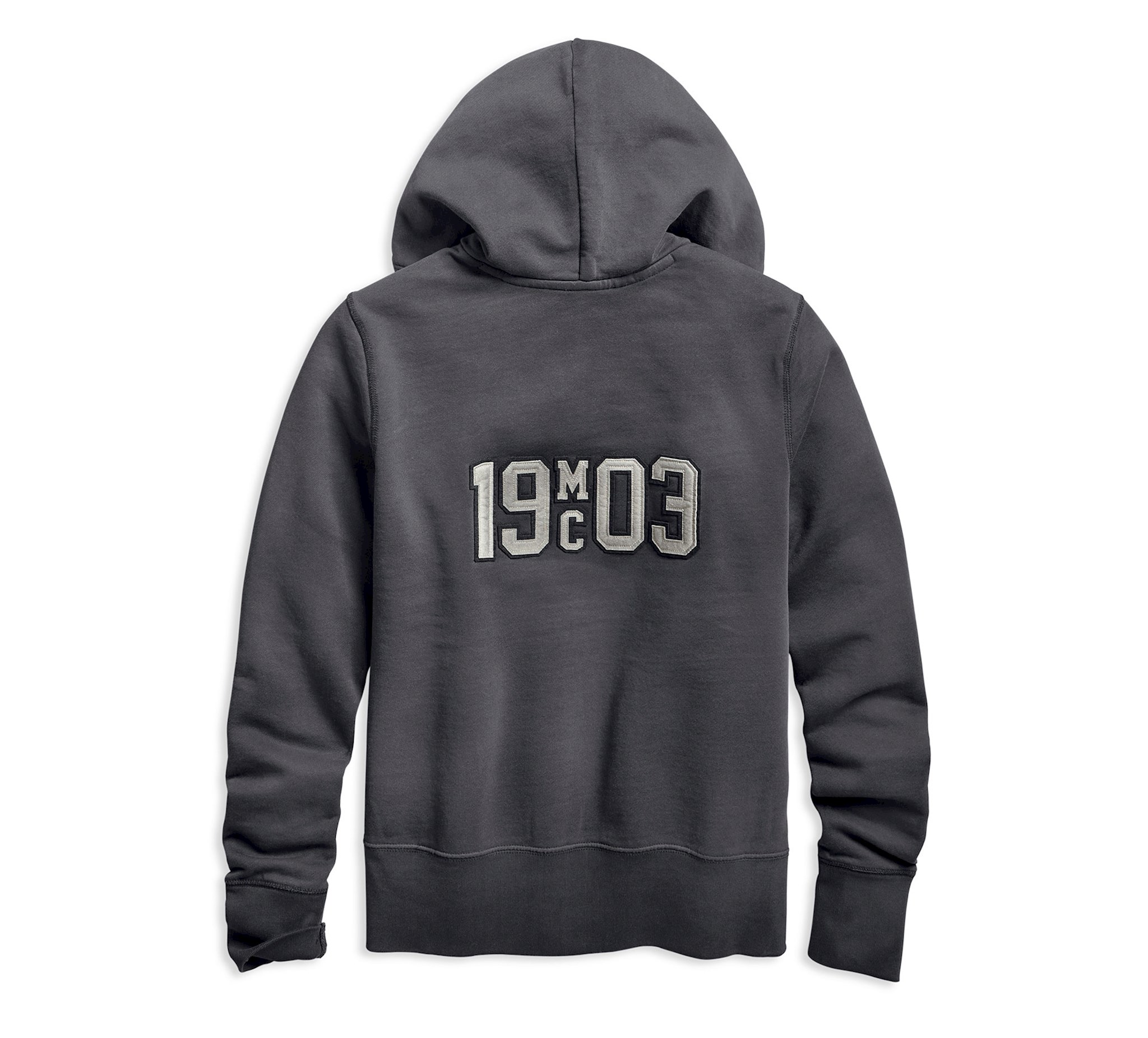Harley-Davidson® Women's Double Layer Felt Letter Hoodie. Made from 100% cotton French terry. Washed for softness. Garment dyed with pigment spray for washed-down look. Rib-knit cuffs and waist. Lined drawstring hood. Zipper front. Kangaroo-style pockets. Embroidered patch. Dirty two-layer felt applique lettering