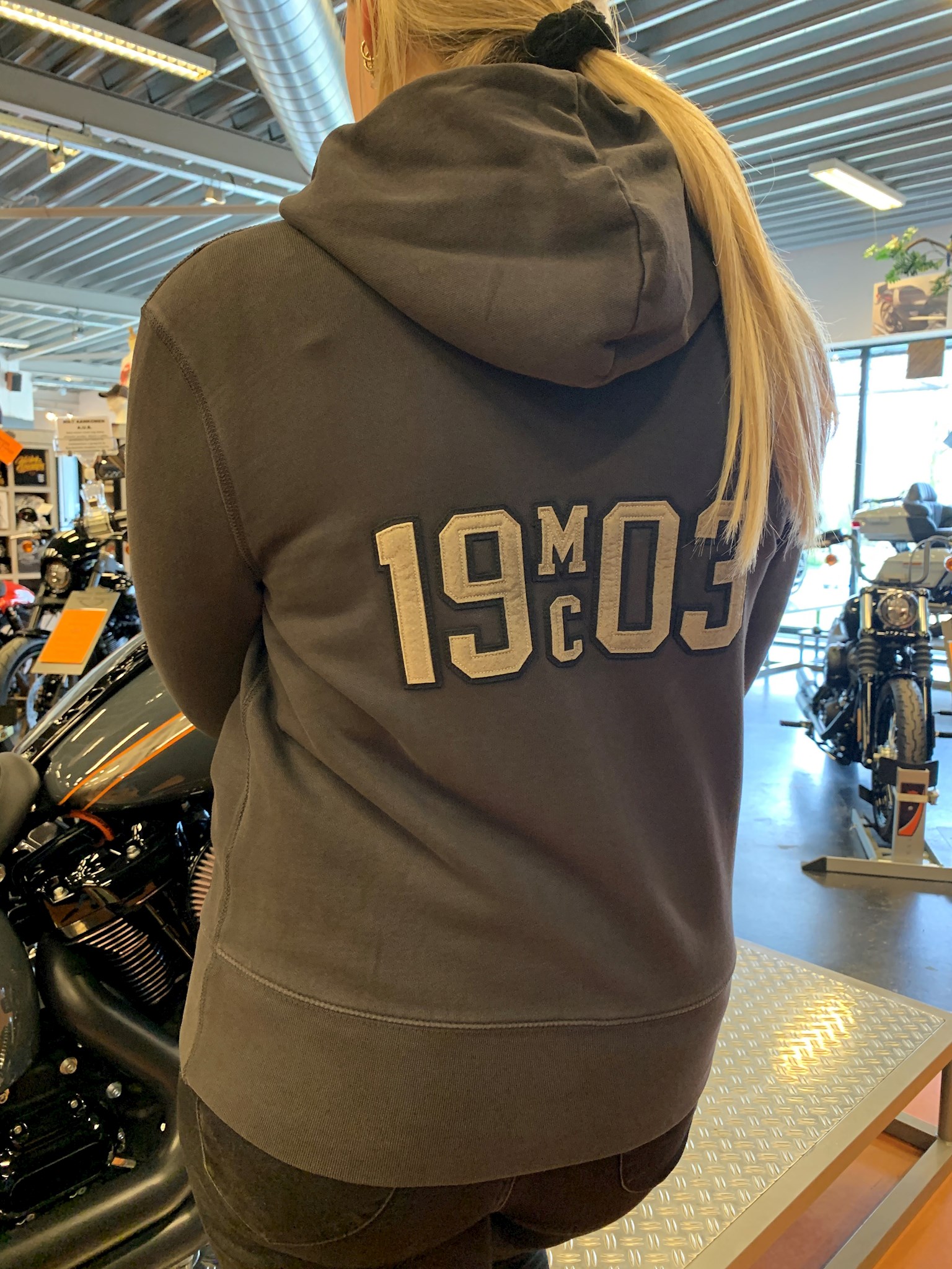 Harley-Davidson® Women's Double Layer Felt Letter Hoodie. Made from 100% cotton French terry. Washed for softness. Garment dyed with pigment spray for washed-down look. Rib-knit cuffs and waist. Lined drawstring hood. Zipper front. Kangaroo-style pockets. Embroidered patch. Dirty two-layer felt applique lettering