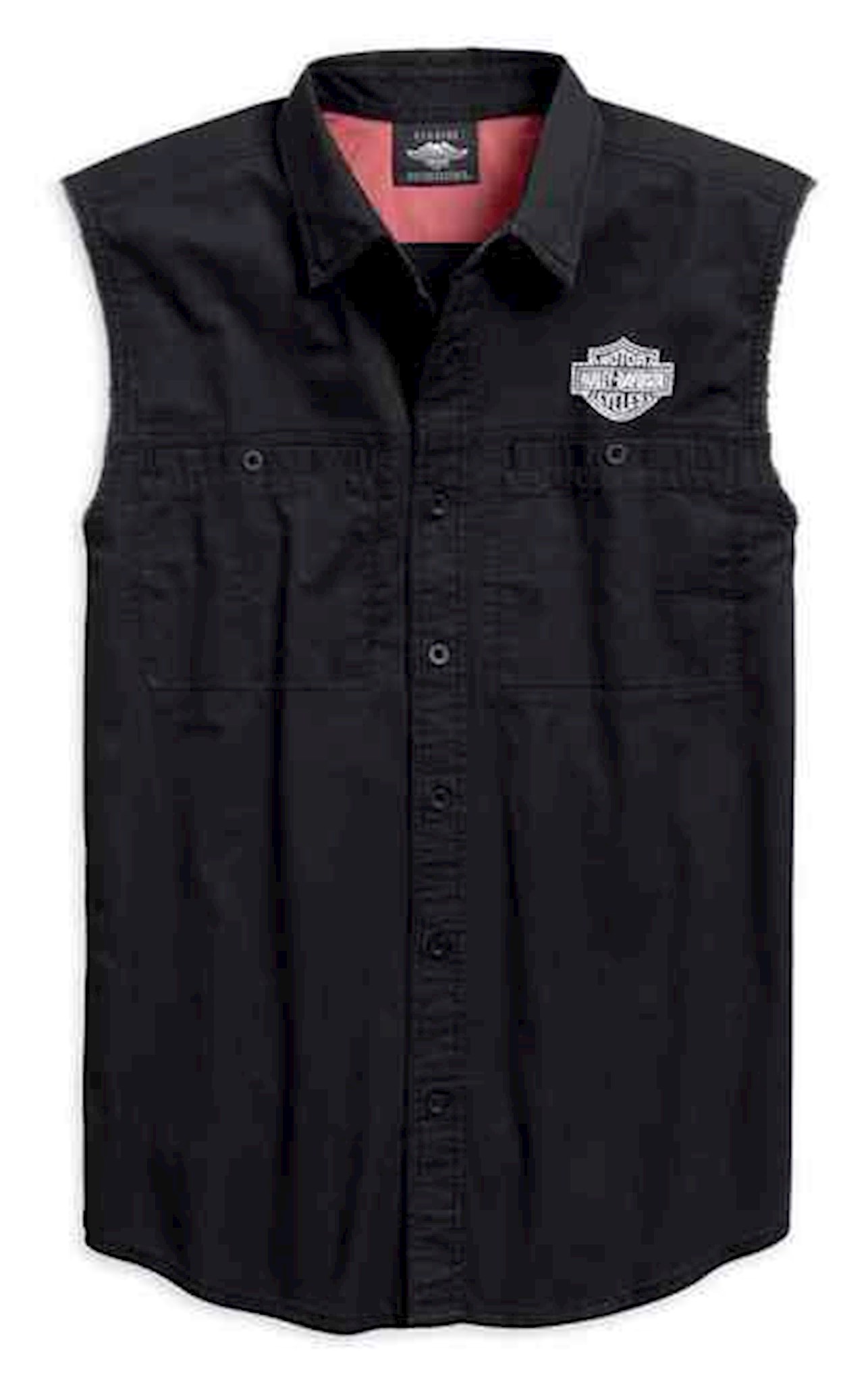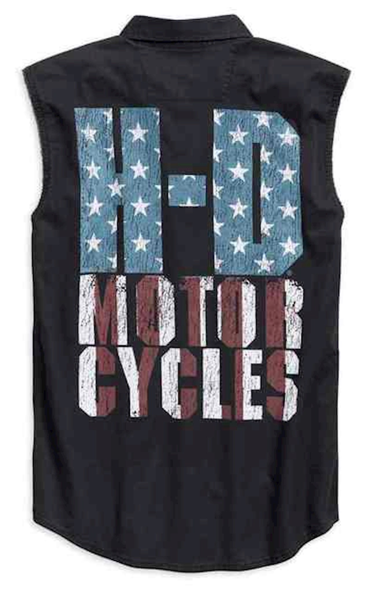 Harley-Davidson® Men's Flag Blowout Shirt - Black, 96766-19VM. Made from 100% cotton twill that is enzyme washed for softness. Snap-down collar. Button front and button chest pockets. Raw-edge armholes. Contrasting inner back yoke lining. Embroidered graphics. Distressed printed graphics.