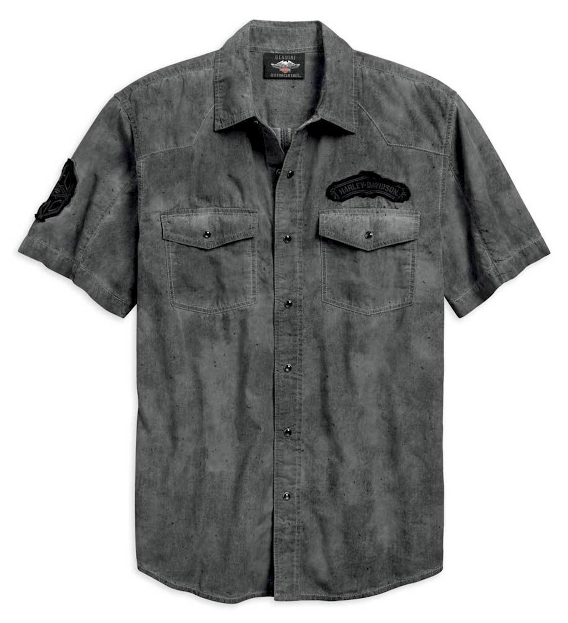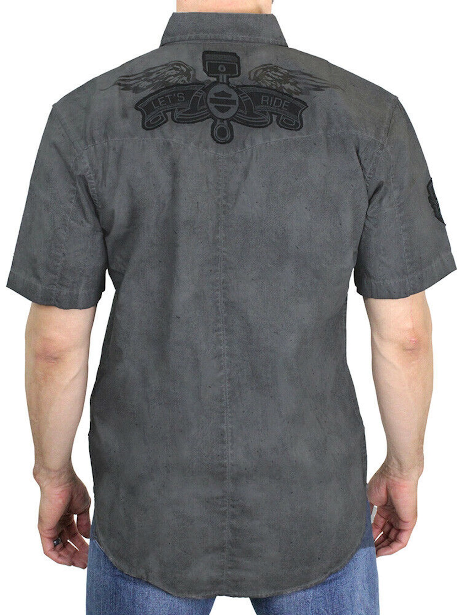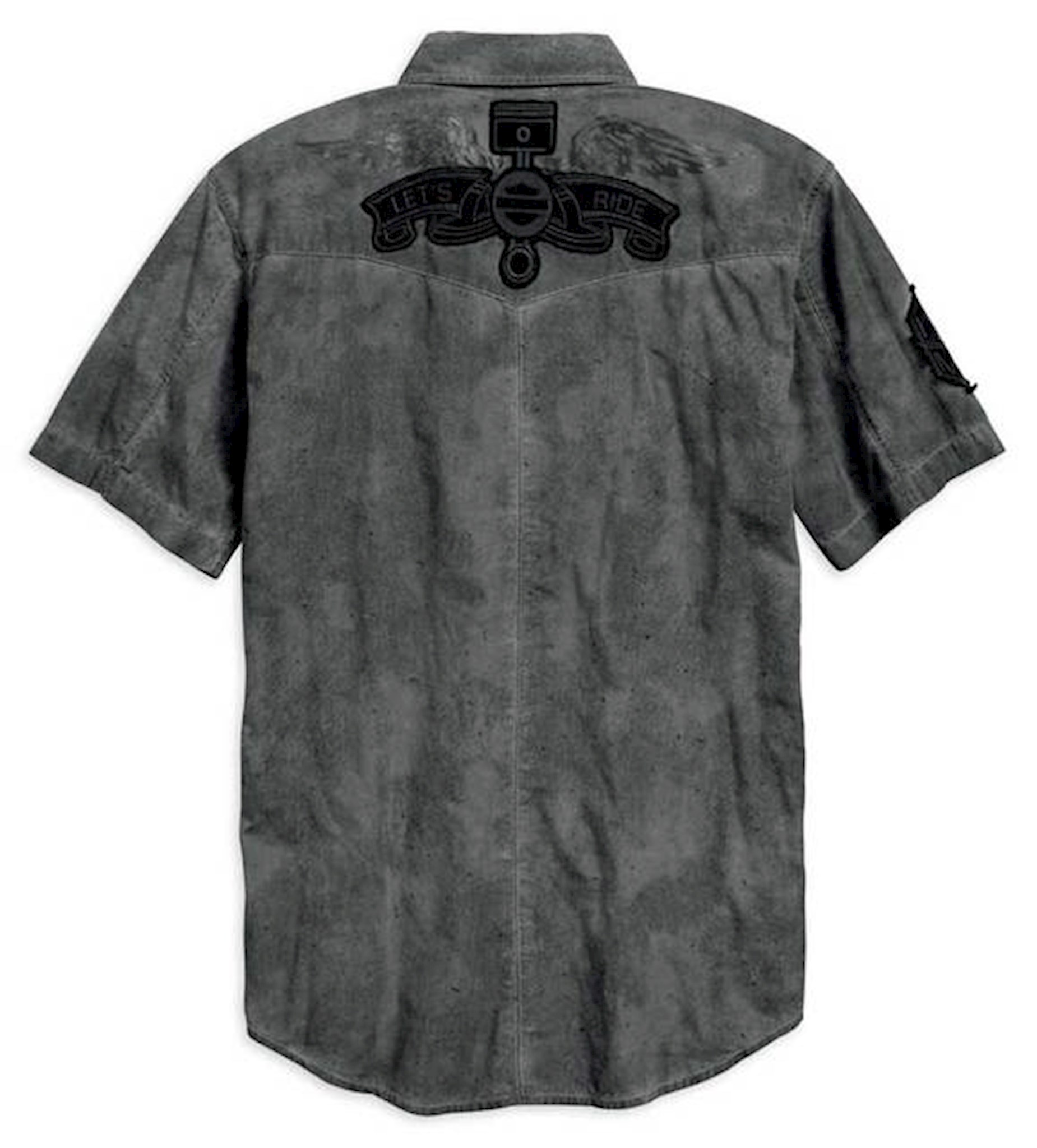 Harley-Davidson® Men's Let's Ride Woven Shirt, 96767-19VM. Made from 100% cotton. Snap-down collar and snap front. Snap flap chest pockets. Allover print gives distressed washed look. Raw-edge embroidered patches. Printed graphics.
