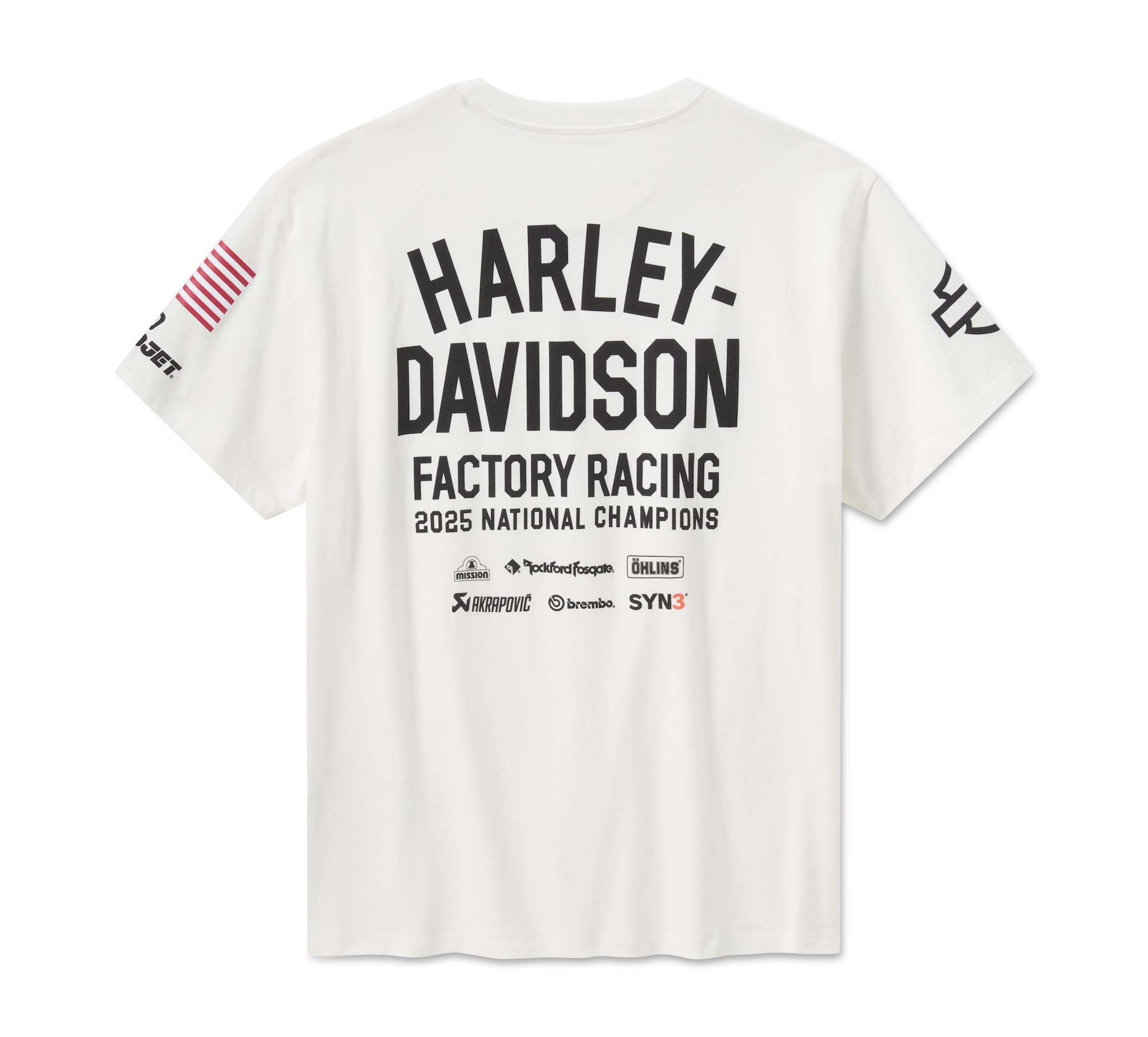 Commemorate several decades of our racing legacy on this special-issue H-D® Championship Tee. It’s made from a breathable, super soft cut of 100% cotton jersey in a relaxed fit with a rib-knit neckline to help keep its shape. This men’s t-shirt is proudly finished with a graphics medley that nods to the sponsors, products, accessories, and championship titles of our factory racing team. Know the history—the arched lettering on back mimics our 1937 racing apparel, while the #1 Logo on front debuted in 1969 to celebrate our AMA Grand National Championship season title. Snag yours while supplies last.