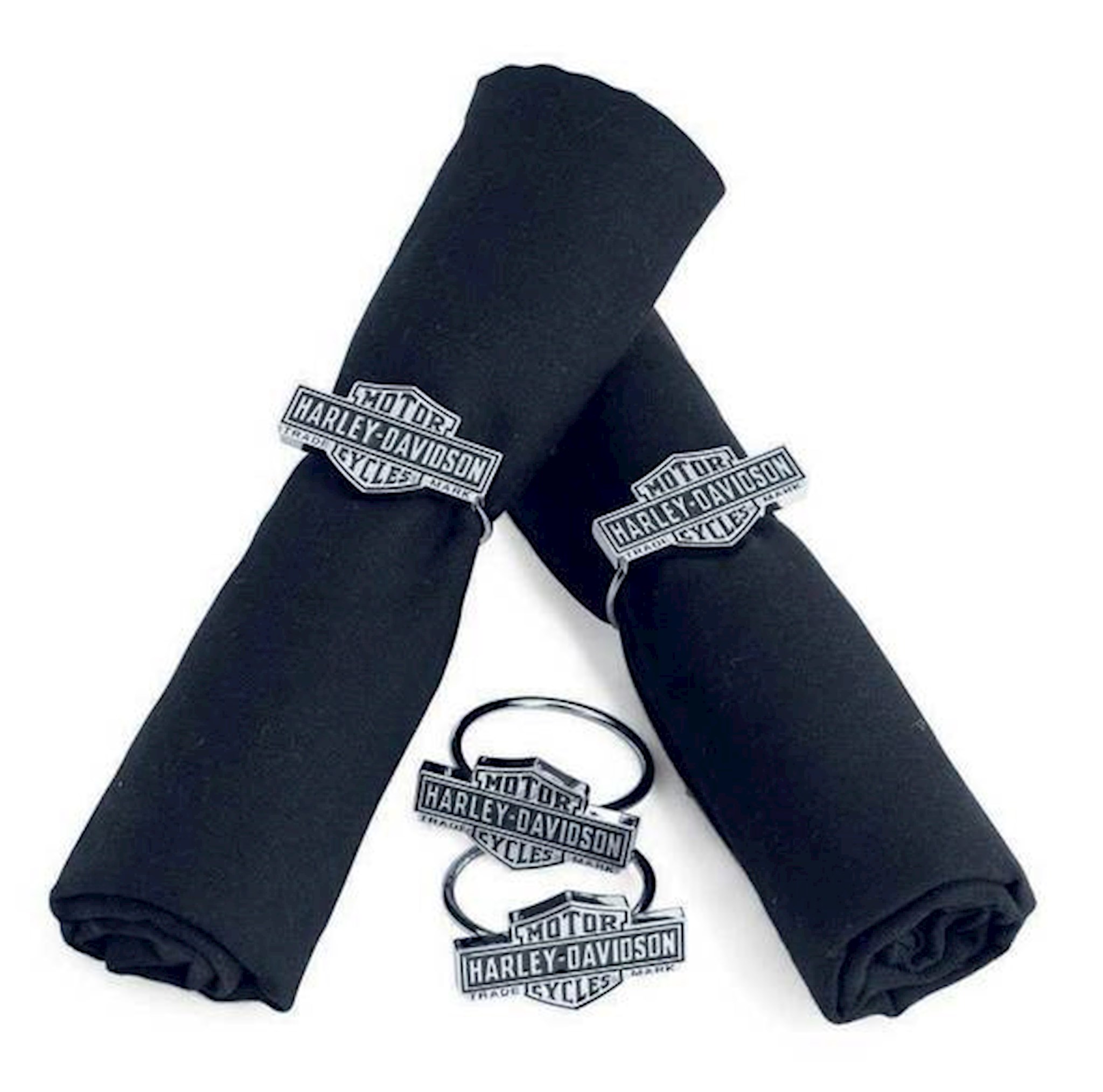 Harley-Davidson® Bar & Shield Napkin Rings. Set of 4 Silver/Black. 96811-14V. Gear up for your holiday celebrations Harley®-style with Bar & Shield Logo Napkin Rings. Chrome-plated zinc alloy napkin rings. Set of 4. Bar & Shield logo graphic on napkin rings. Each piece measures 2-3/8'' x 2-1/8'' x 1-1/4''.