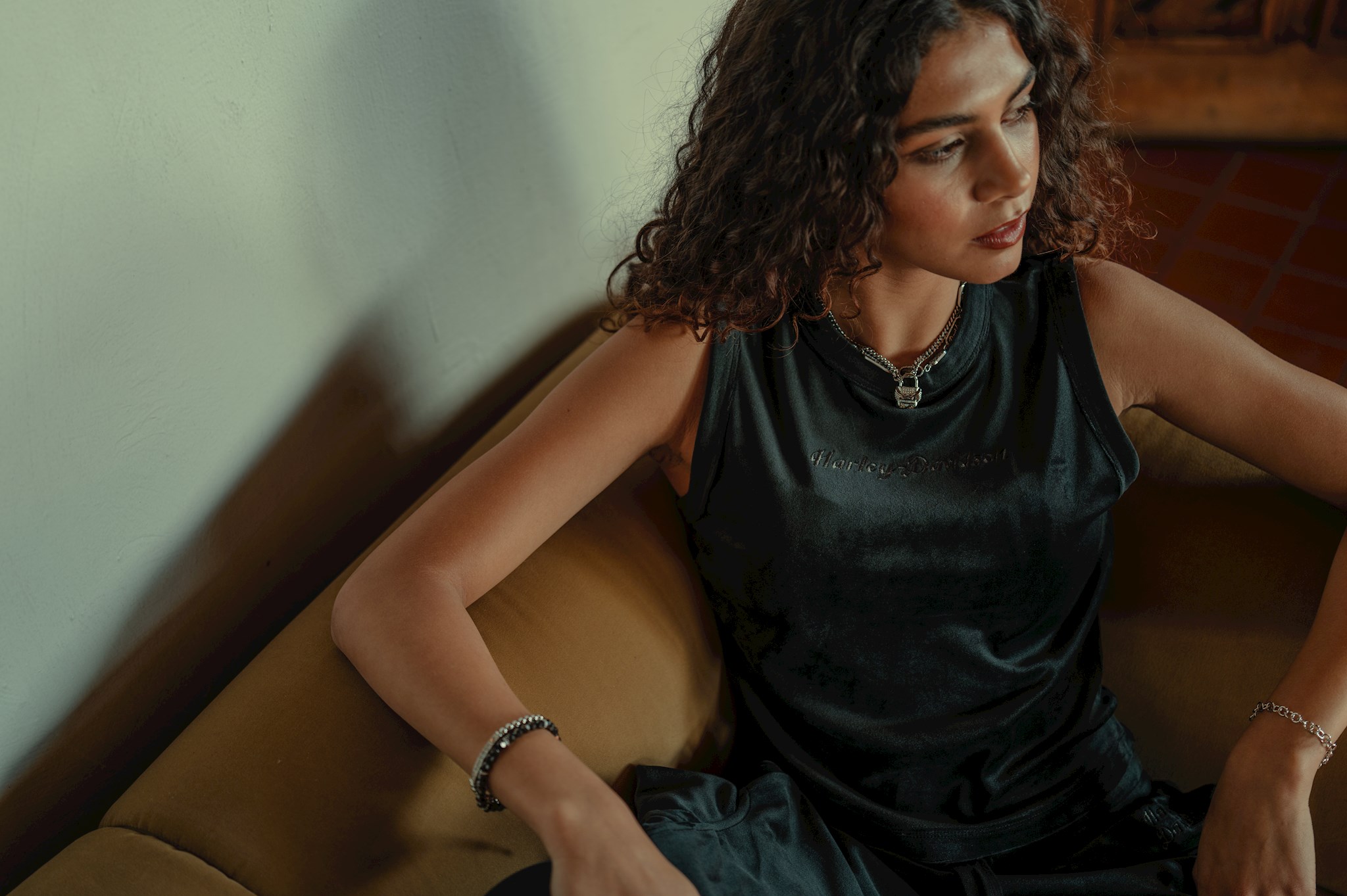 Mouwloos, fluweelzacht comfort is helemaal voor jou in onze velours tanktop met ronde hals. Hij is gemaakt van zwaar polyester keperfluweel met wat elastaan voor extra stretch. Deze tanktop voor vrouwen in een korter, getailleerd silhouet heeft een wijde halslijn en armsgaten. Hij is afgewerkt met scriptgraphics aan de voorkant in glanzend ton-sur-ton borduurwerk, voor een ingetogen Harley-Davidson-look.