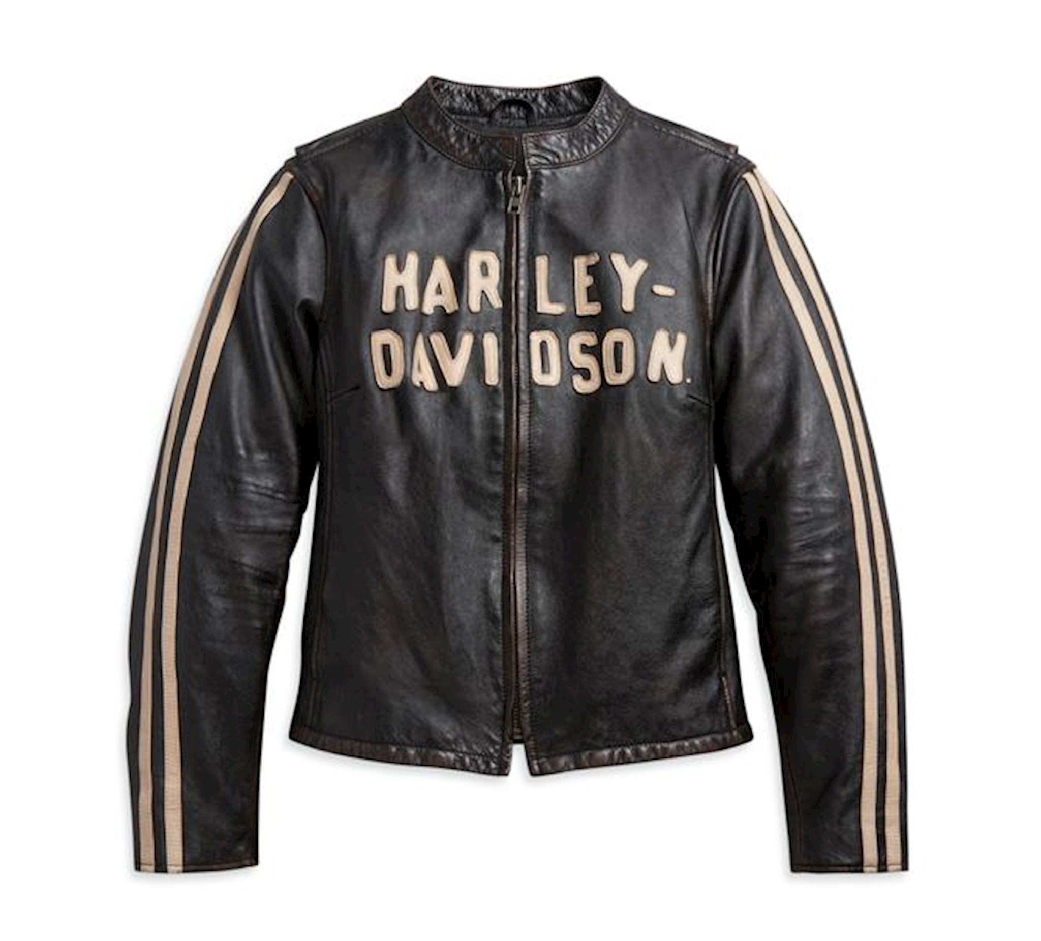 Harley-Davidson® Women's Sleeve Stripe Leather Jacket - Black, 97000-21VW. Constructed from high-quality cowhide leather. Zippered front. Sporty stripes on sleeves. Two hand-warmer pockets. Comfortable action back. Laser cut applique graphics. Racing-inspired retro leather jacket.