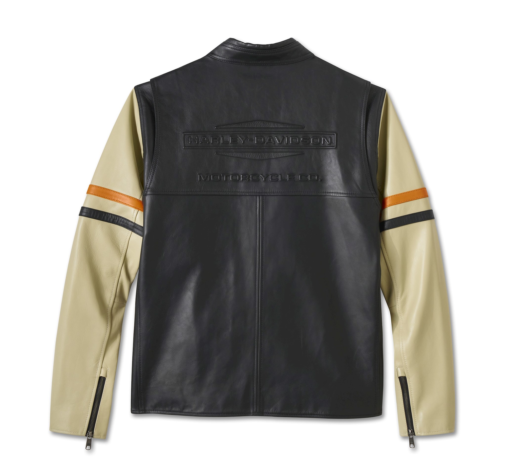 LIMITED EDITION! Fit & Mobility: Fit & Mobility: Action back. • Materials: Materials: Midweight cowhide. 100% nylon lining. • Closure: Closure: Two-way zipper front. Zippered sleeves. • Pockets: Pockets: Welt hand-warmer pockets with zipper closure. Interior welt chest pocket with hidden snap closure. • Design Details: Design Details: Contrast front yoke and sleeves. Leather piecing on chest and upper sleeves. Snap-tab mandarin collar. • Graphics: Graphics: Embroidered twill patch. Embossed. Direct embroidery.