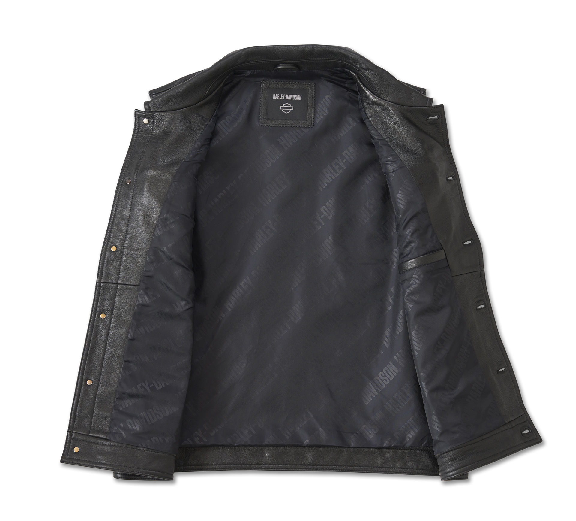 Materialen: Middelzwaar rundleer, gewassen met water en voorzien van een wascoating. Voering van 100% nylon keperstof. • Sluiting: Knoop aan de voorkant. • ZAKKEN: Paspelzakken met verborgen drukknoopsluiting. Borstzakken met klep en knoop. • Ontwerpdetails: Kraag met verborgen drukknopen. Allover bedrukte voering. • Graphics: Bedrukte keperstofpatch. Geborduurde keperstofpatch. Directe borduursels.