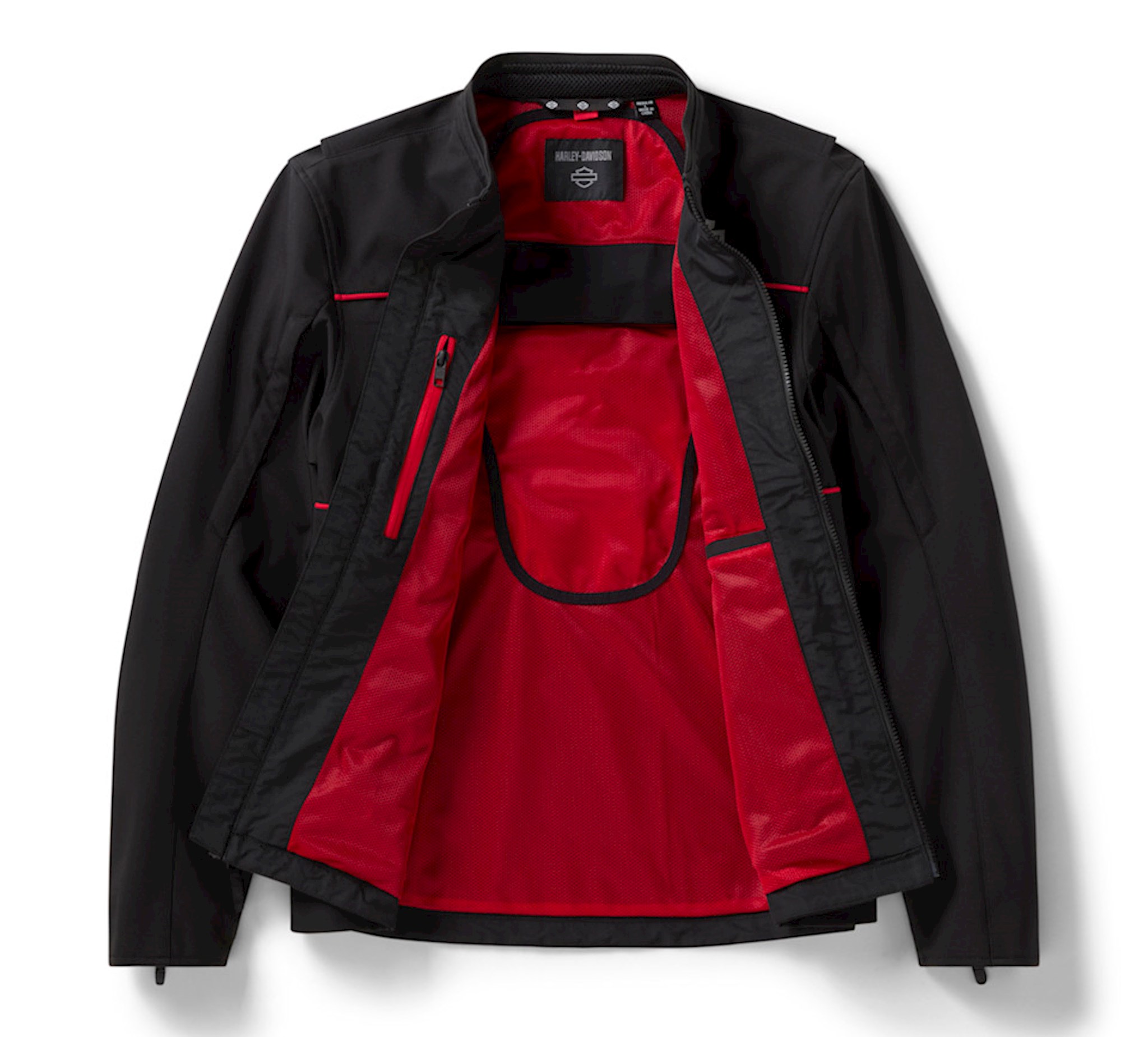 Blijf koel: Met rits op de mouw voor luchtcirculatie. Blijf warm: Gemaakt van winddicht materiaal. Pasvorm & bewegingsvrijheid: Action back. Voorgevormde mouwen. Materialen: 90% polyester, 10% spandex softshell. Voering van 100% polyester mesh. Sluiting: Tweewegrits aan de voorkant. Manchetten met ritssluiting. ZAKKEN: Handwarmerzakken met ritssluiting. Een opbergvak aan de binnenkant en een binnenzak met ritssluiting. Additional Features: H-D® CE-gecertificeerde PBM is getest en gecertificeerd op slijt- en scheurvastheid en naadsterkte. Inclusief EN 1621-1 D3O® Ghost™ protectie op schouders en ellebogen (98104-22VR & 98103-22VR). De rugprotectorzak is voorbereid op EN 1621-2 gecertificeerde D3O® Viper-rugprotector (98317-25VR, apart verkrijgbaar). 3M™ Scotchlite™ reflectiemateriaal. Ontwerpdetails: Contrastvoering en biezen. Graphics: Zeefdruk. Certification: Gecertificeerd volgens EN 17092-4:2020.