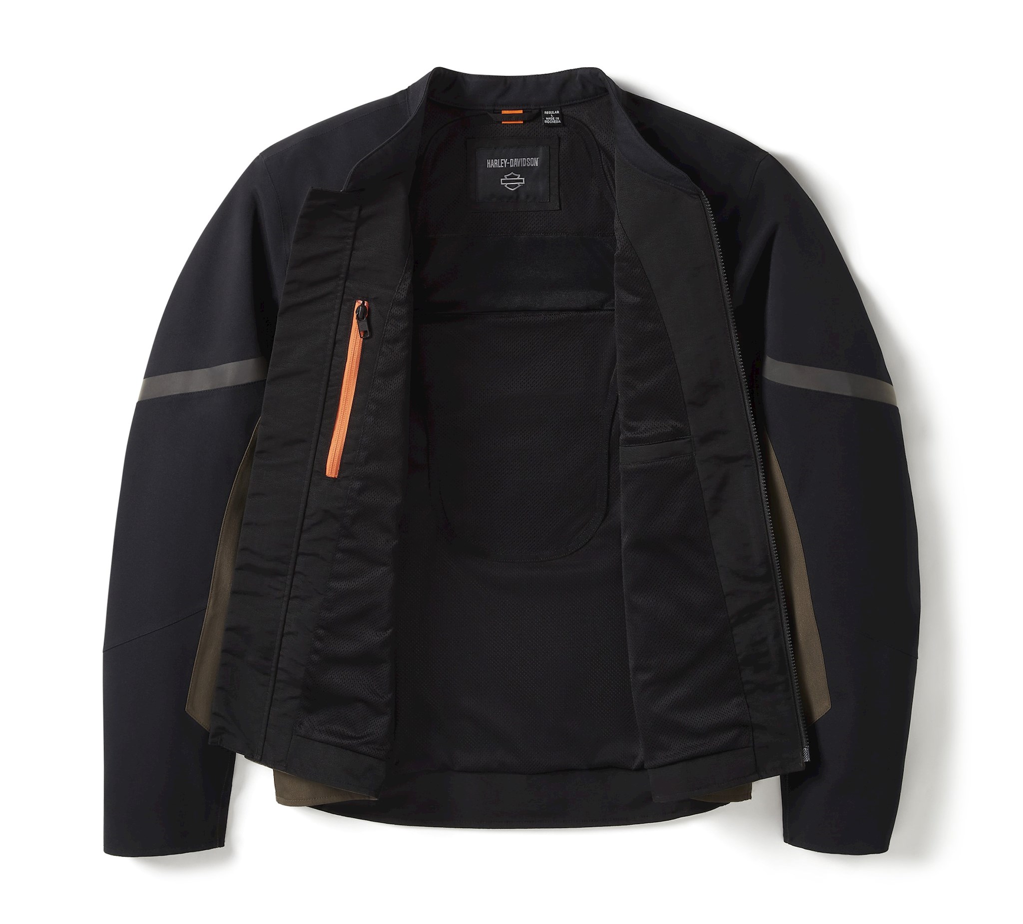 Geniet van jouw motorrit en vergeet de regen met ons H-D® Waterproof Textile Riding Jacket. Het jack is gemaakt van robuuste, gelamineerde polyester keperstof die waterdicht is en de naden zijn afgedicht met waterbestendige ritsen. Het maakt je rijcomfort een prioriteit met functies zoals ventilatie met ritssluiting, reflecterend materiaal om de zichtbaarheid te vergroten en impactbescherming door D3O® Ghost™ protectoren in de schouders en ellebogen. Dit motorjack voor mannen is getest en gecertificeerd om te voldoen aan de vereisten op het gebied van slijtvastheid, scheuren en naadsterkte. De contrasterende afwerking vormt een aanvulling op onze gave Bar & Shield-graphics voor een duurzame H-D-look. Bekijk alle specificaties en koop er een voor jezelf zolang de voorraad strekt.
