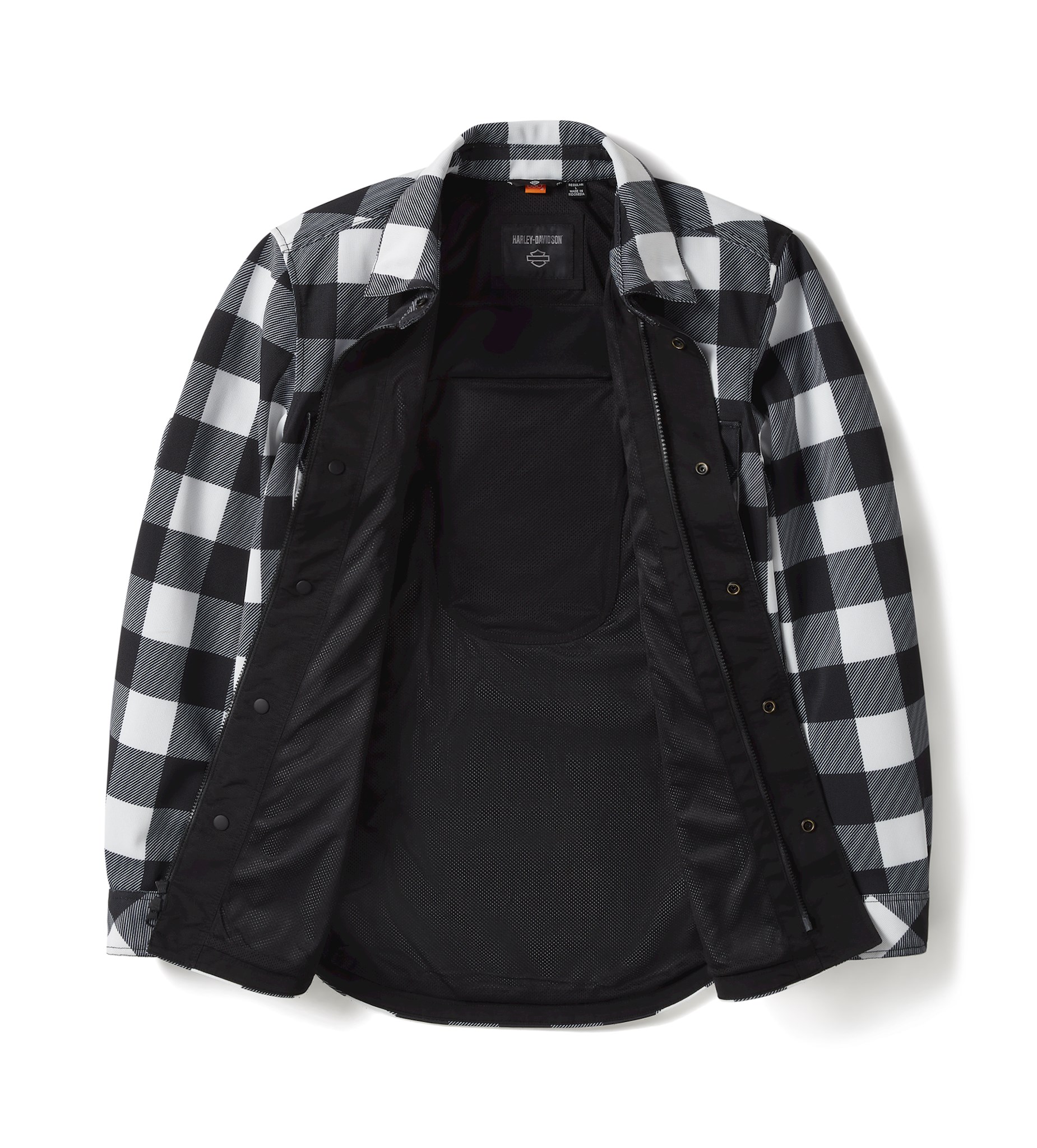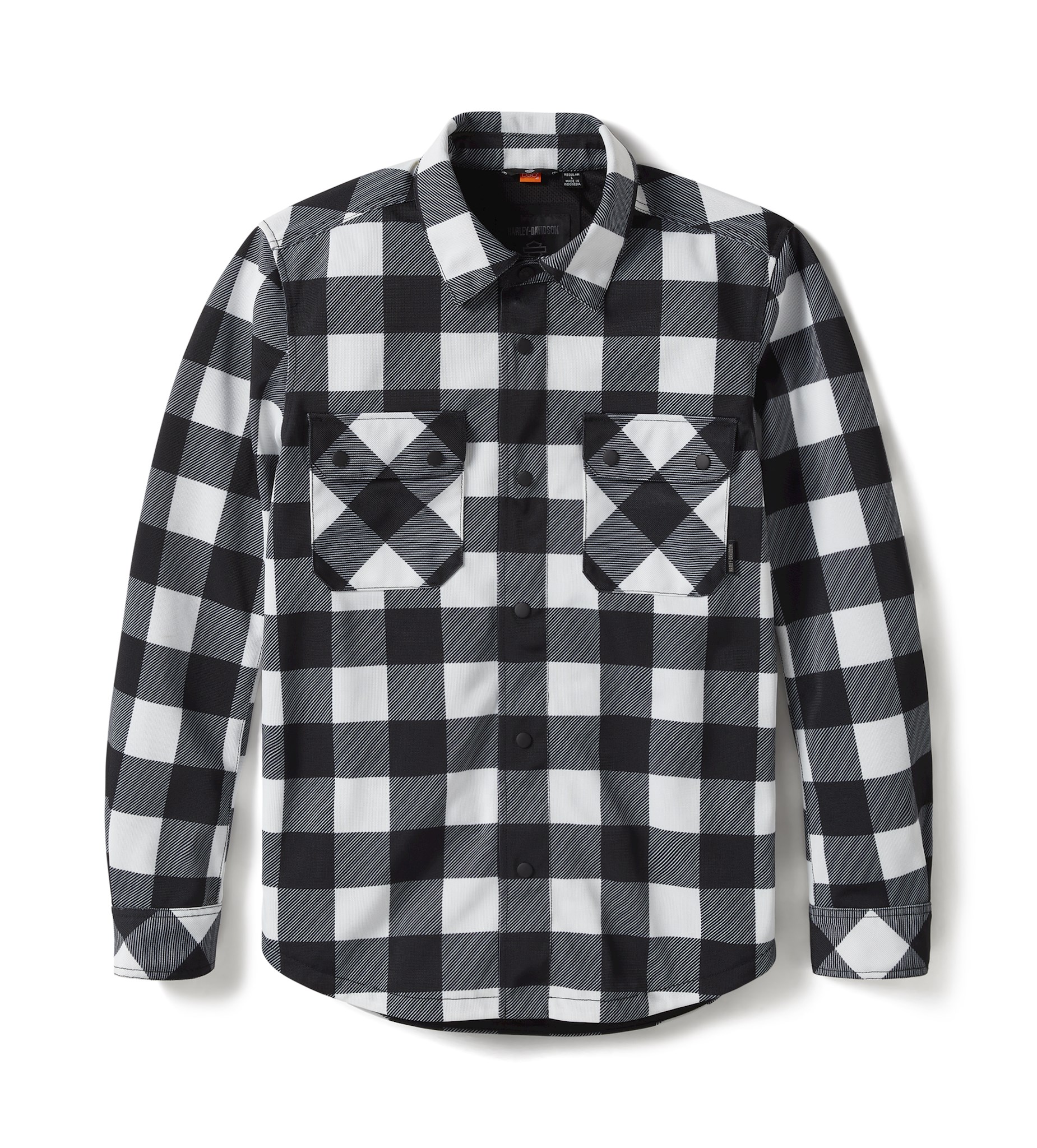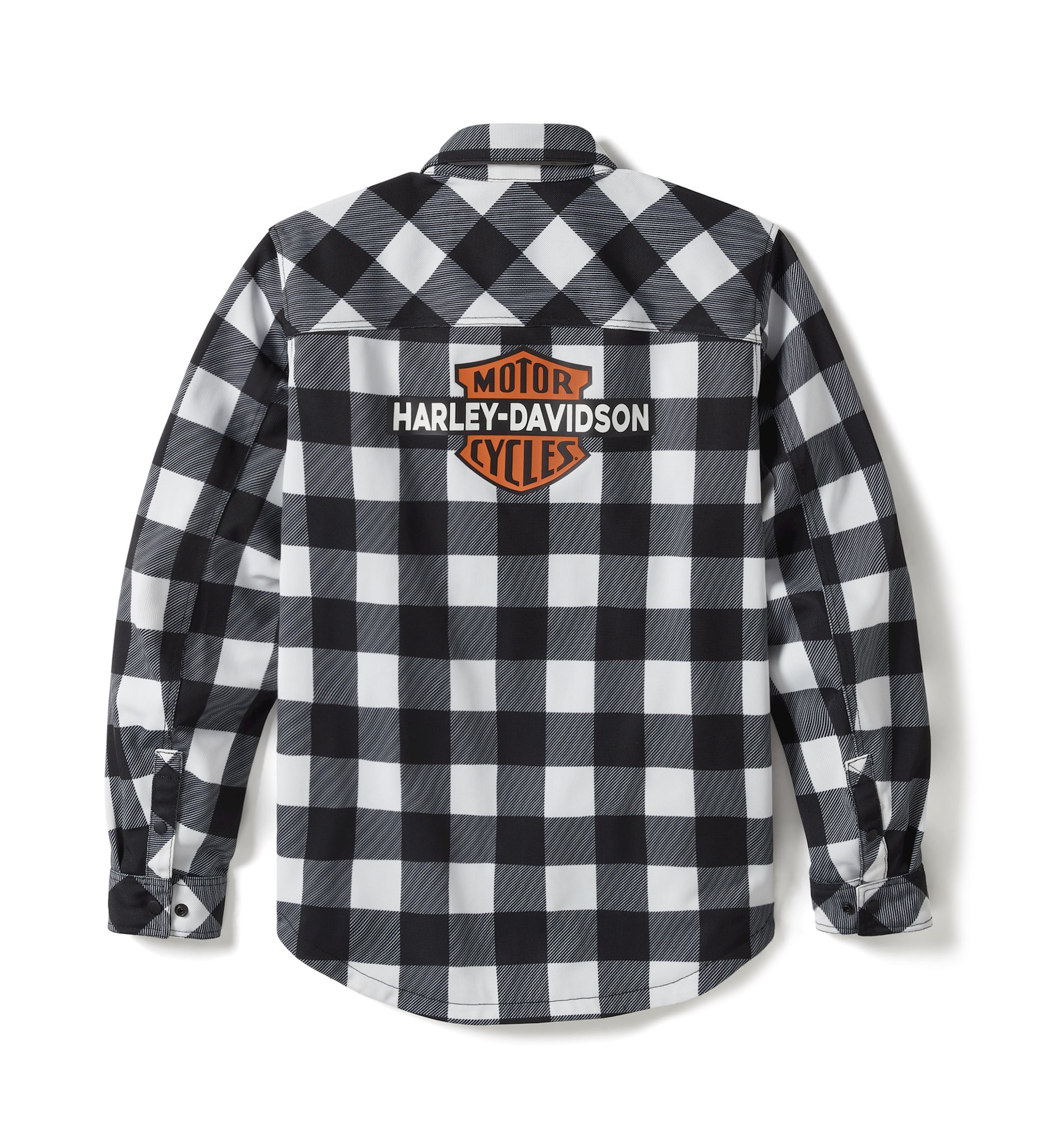 Buffalo check style meets breathable, lightweight protection in our latest H-D® Mesh Operative Riding Shirt Jacket. Its allover knit mesh construction welcomes more airflow than our previous Operative twill styles, plus we’ve updated the snaps and placket. It has reflective material to enhance visibility, a hidden snap-down collar that won’t flap around during rides, and is equipped with superior impact protection from our D3O® Ghost™ armor at the shoulders and elbows. This men’s motorcycle shirt jacket is also tested and certified to meet abrasion, tear, and seam strength requirements (more details below). It’s finished with nostalgic graphics on back—a modern-day replica of the Bar & Shield that appeared on our 1920s oil cans.