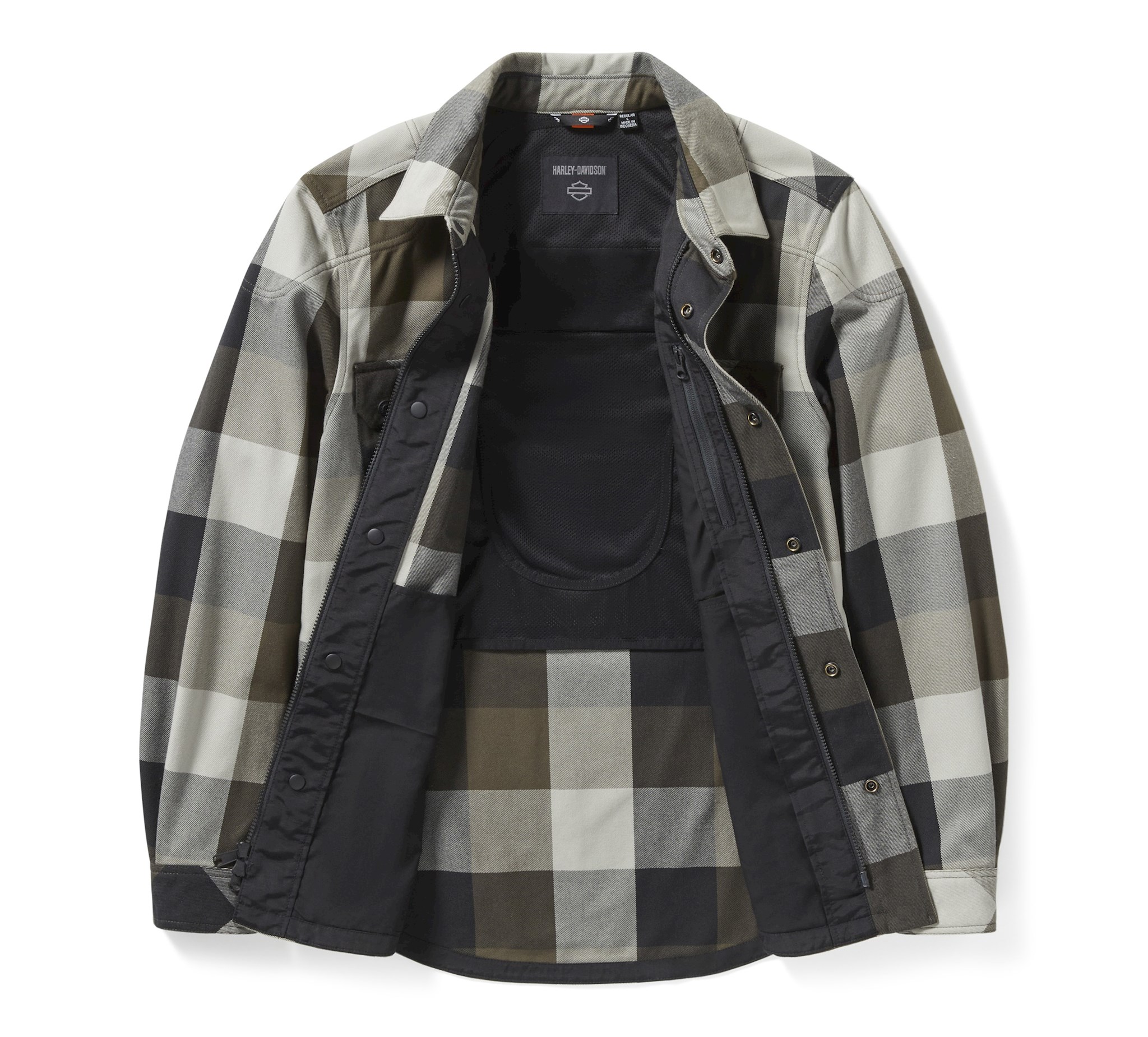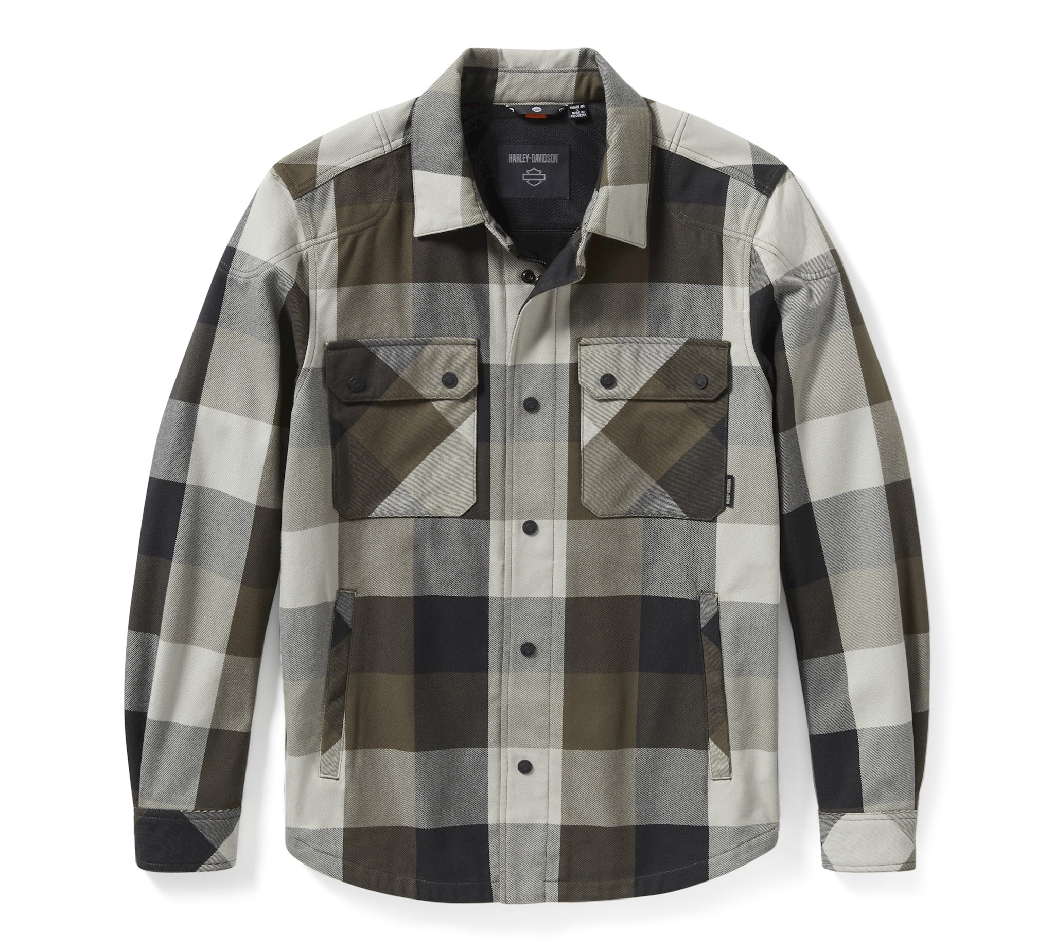 Our latest H-D® Operative 2.0 Riding Shirt Jacket is a must-have for the rider on your gift list. Its heavyweight twill blend features a partial lining to feel more like a shirt than a jacket. It has reflective material to enhance visibility, a hidden snap-down collar that won’t flap around during rides, and is equipped with superior impact protection from our D3O® Ghost™ armor at the shoulders and elbows. This men’s motorcycle shirt jacket is also tested and certified to meet abrasion, tear, and seam strength requirements (more details below). Its handsome earth-tone plaid pattern is lowkey branded on front while embroidered graphics fill the back. Know the history—the lettering style on back mimics our 1920s racing team jerseys. See the specs below, then order yours ASAP.