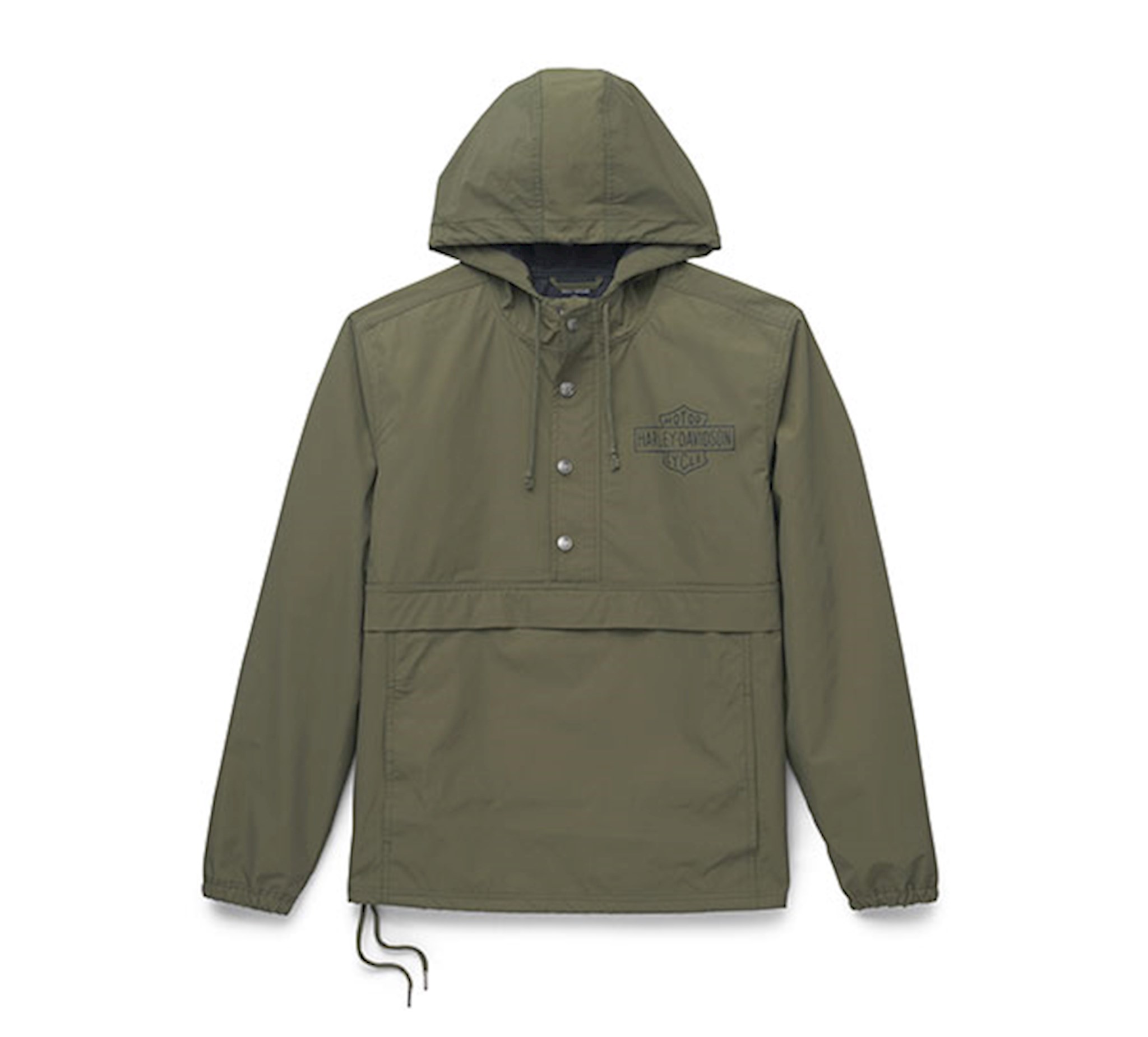 Sporty style meets practicality in our Essential Anorak. Made from a water-repellent blend of nylon and cotton dobby with an adjustable hem and elastic cuffs for added protection against soggy conditions. The drawcord hood and generous-sized pockets make this an ideal throw-on for outdoor events like, games, hikes, or bonfires. Finished with a hit of H-D® history—our earliest Bar & Shield (circa 1910) is printed on the front.