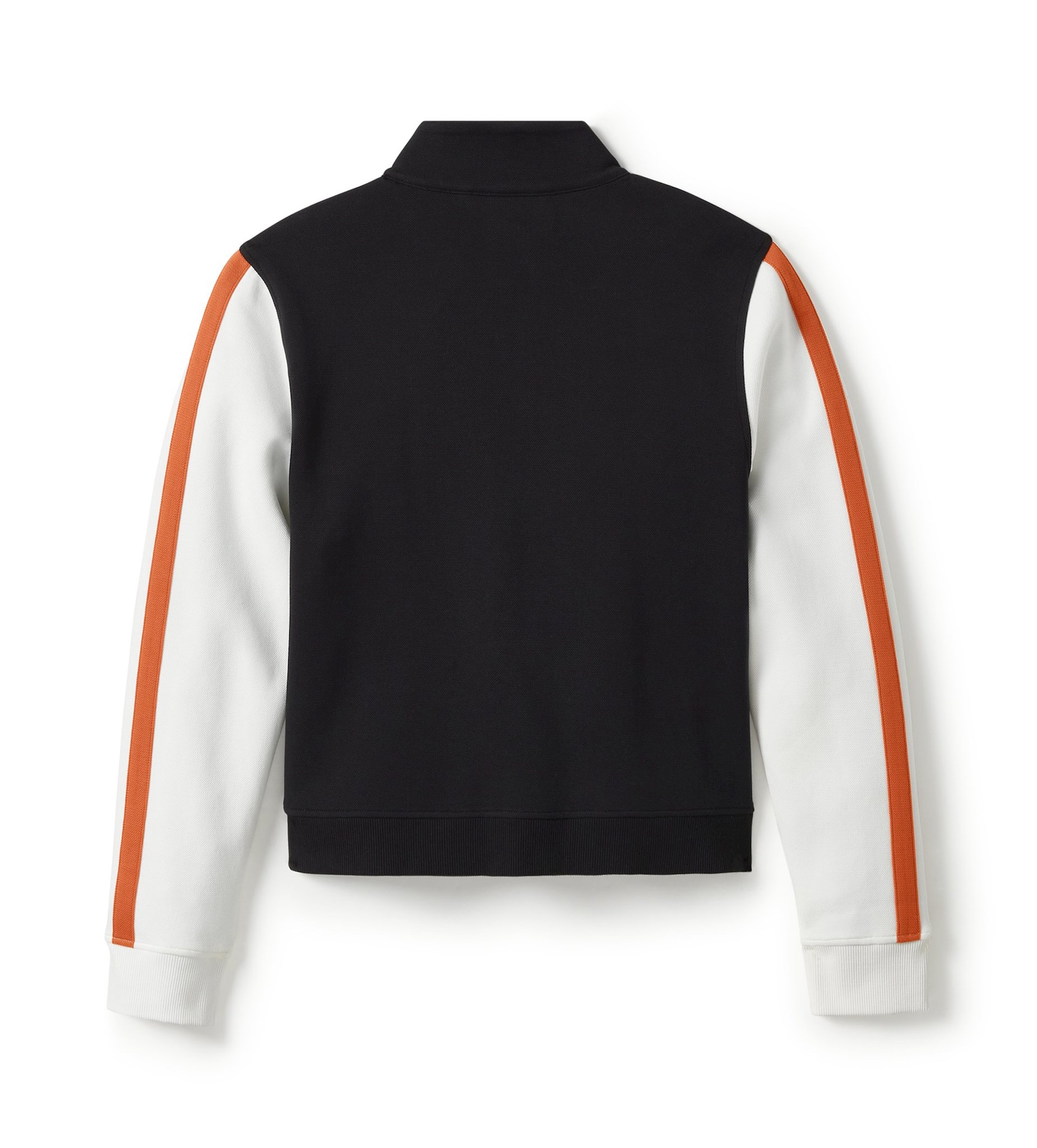 Materialen: 60% katoen, 40% polyester zwaargewicht jacquard breisel. • Sluiting: Ritssluiting aan de voorkant. • ZAKKEN: Paspelzakken met verborgen drukknopen. • Ontwerpdetails: Korter, slim-fit silhouet. Trechter hals. Contrasterende mouwen. Aan de bovenkant aangebrachte mouwstriping. Ribgebreide manchetten en zoom. • Graphics: Applicatie van keperstof aangebracht met satijnsteekborduurwerk. • 23".
