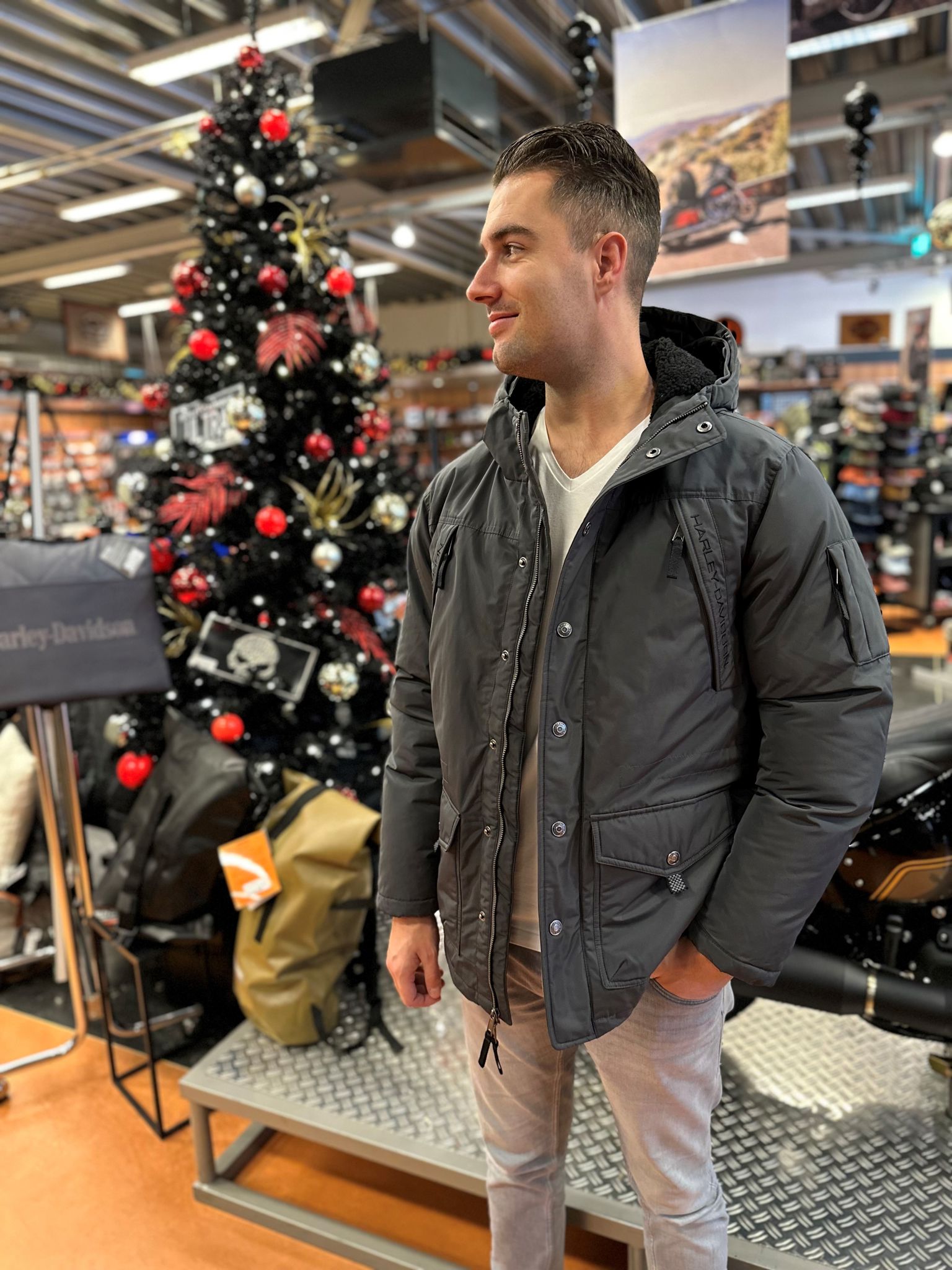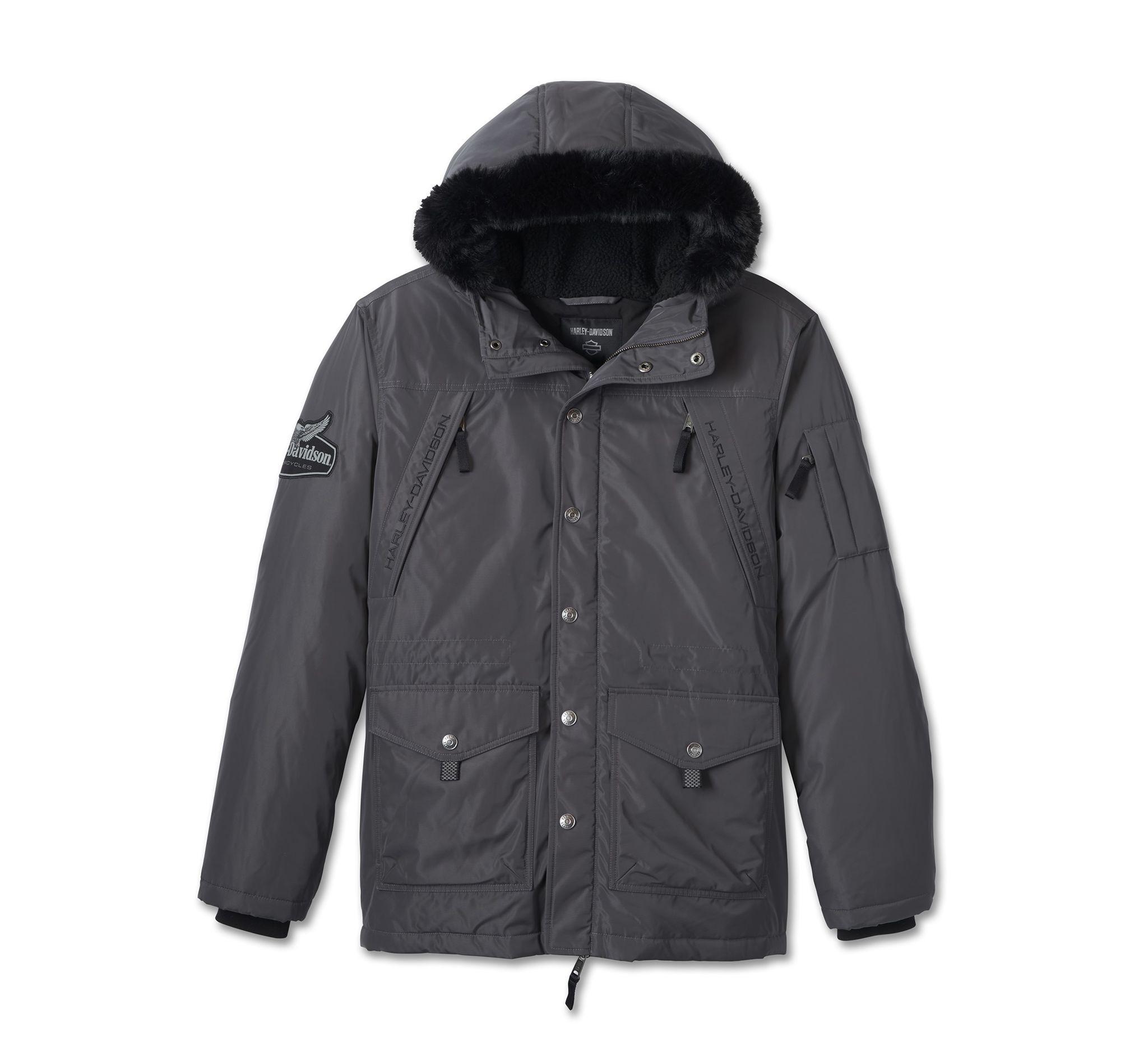 100% polyester midweight twill. 100% polyester twill lining. Poly fill. Snacp placket with two-way hidden zipper. Chest welt pockers with zipper closure. Removable faux fur trim.