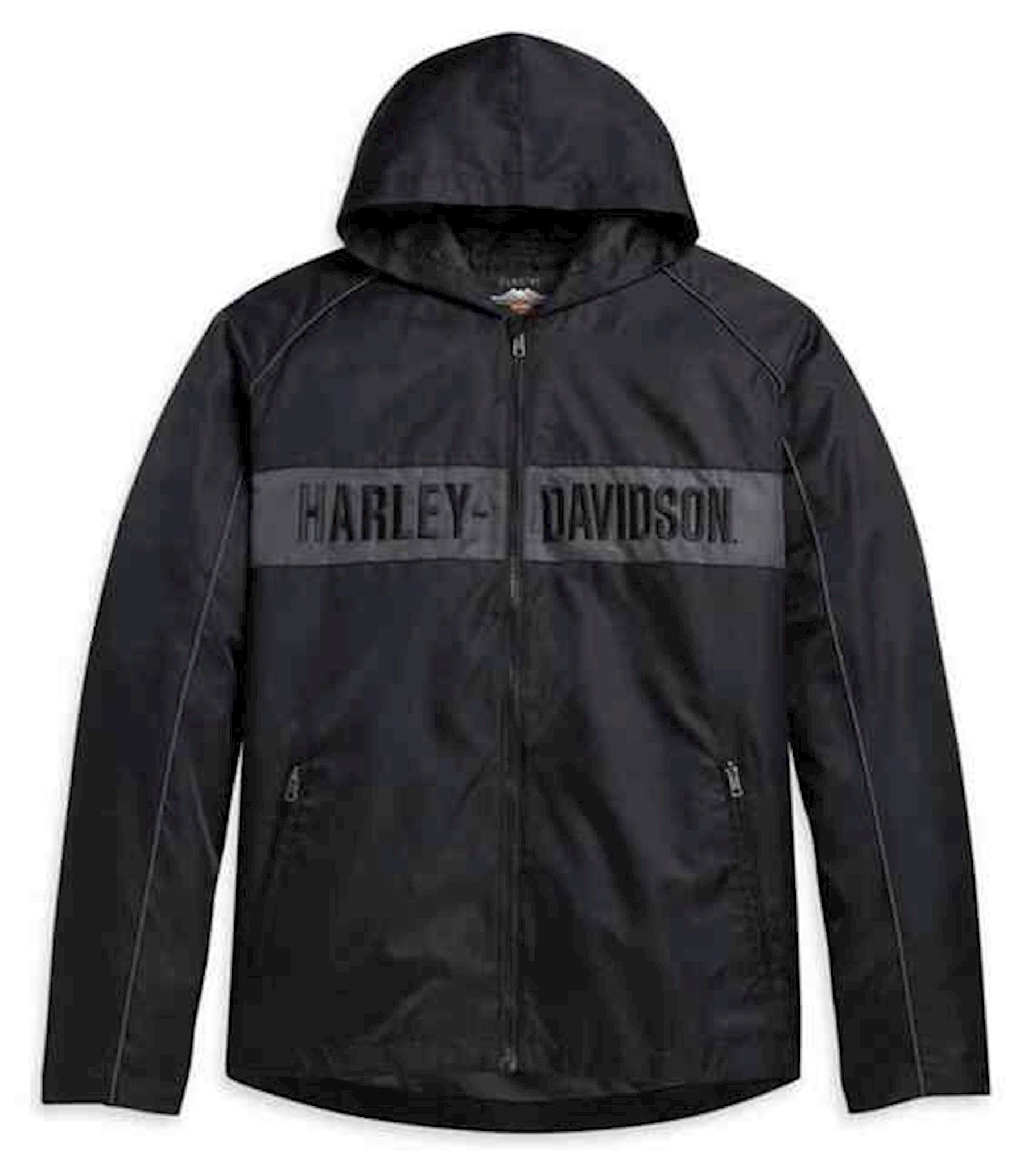 Harley-Davidson® Men's Hooded Stripe Jacket - Black, 97432-21VM. Made from 100% nylon twill. Zippered front, cuffs and pockets. Embroidered graphic across chest with piping detail down sleeves. Light-weight and smart, this jacket will break the wind that tires to come at you.