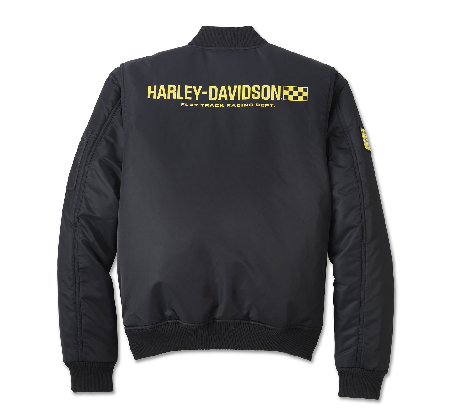 Bomber styling is revamped for serious H-D racing fans on this Limited Edition. The At the Crank Bomber Jacket features a shoutout to our XR-750 model and other custom canvas patches that honor our 1970s racing era. Made from rugged nylon twill, this men’s jacket is poly filled for added warmth. Designed with an action back, a zippered sleeve pocket, and a unique allover printed lining (zoom in to check it out). Make-a-statement style like this is only here while supplies last—sang yours now.