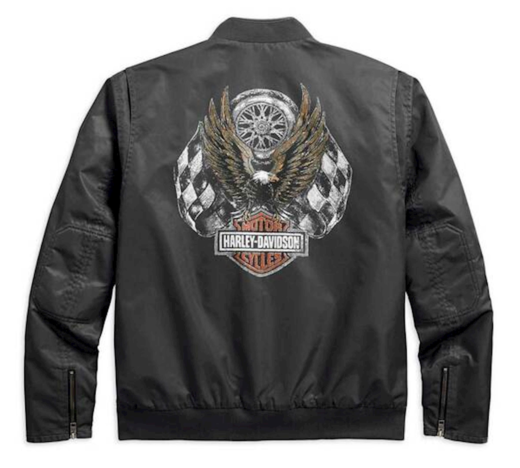 Harley-Davidson® Men's Checkered Flag Eagle Bomber Jacket, 97455-18VM. Made from 100% nylon twill with enzyme wash. Printed polyester twill lining. Rib-knit collar and waist. Zipper front and cuffs. Lightly padded elbows. Action back. Two snap flap hand-warmer pockets, two zipper hand-warmer pockets, and one zipper chest pocket. One horizontal interior pocket and one zipper vertical interior pocket. D-ring key fob on right pocket