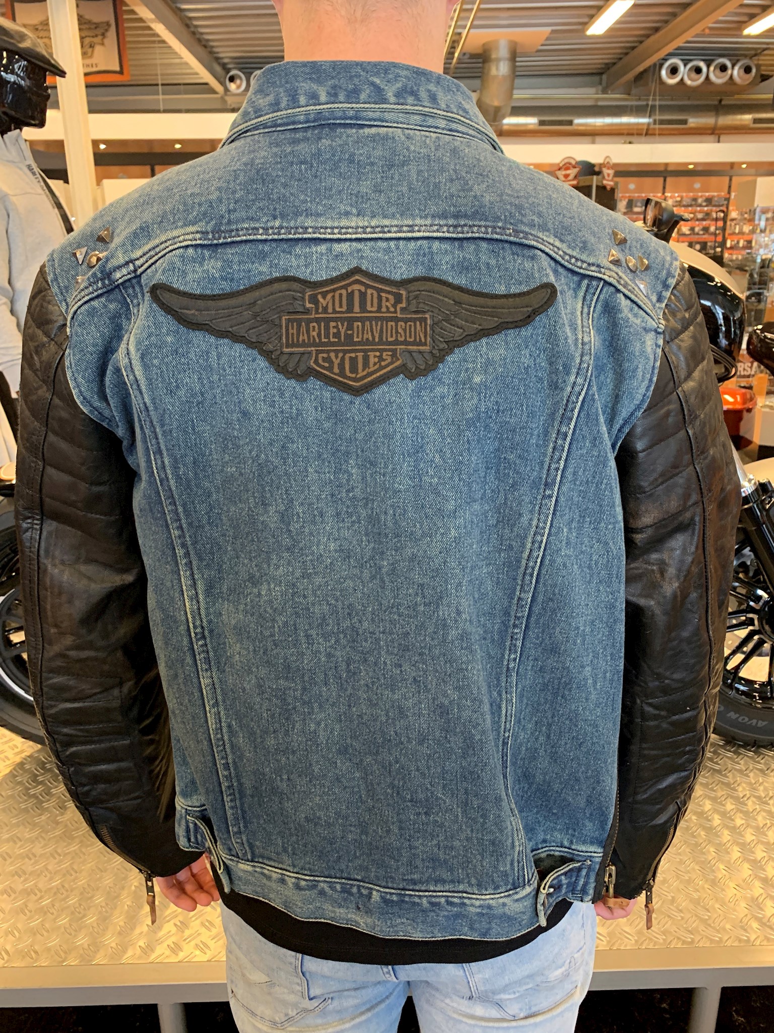 Harley-Davidson® Men's #1 Leather Sleeve Slim Fit Denim Jacket. Made from 100% cotton denim with heavy enzyme and stone wash for a vintage, lived-in look. Lightweight cowhide leather sleeves with wax finish are washed, tumble-dried, and hand-sanded for distressed, vintage look. Snap-down collar. Button front. Button waist tabs. Two snap hand-warmer pockets. Two button flap chest pockets. Side zipper. Studs on shoulders. Coated embroidered patches on left sleeve, right chest, and back. Slim Fit that is narrower throughout.