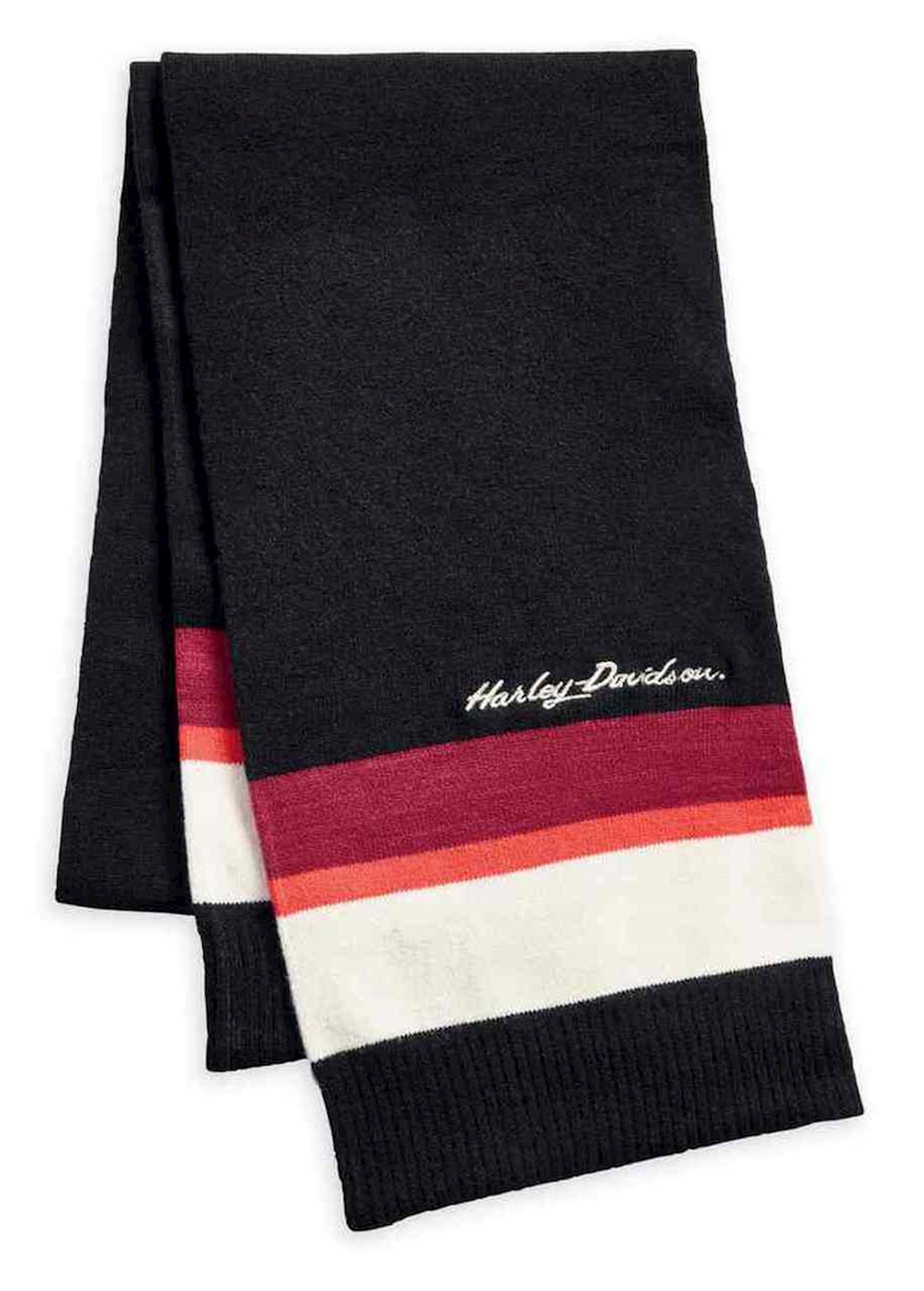 Harley-Davidson® Women's Striped Colorblocked H-D Script Knit Scarf, 97746-19VW. Made of 96% acrylic, 4% spandex. Knit in stripes. Features embroidered Harley-Davidson® script graphics. One size fits most. Great for fall and winter wear.