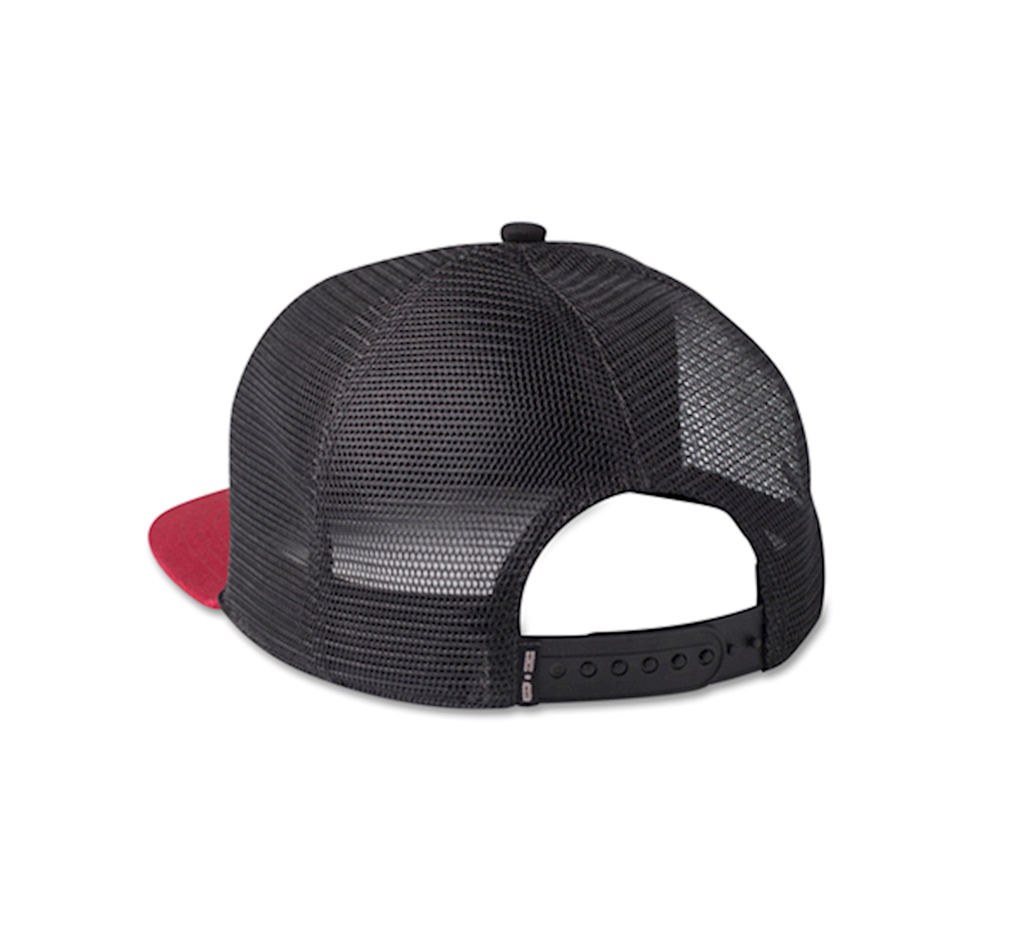 Materials: 100% cotton twill, 100% polyester mesh. Closure: adjustable closure. Design details: contrasting brim. Graphics: Direct embroidery. Color: Black, Red.