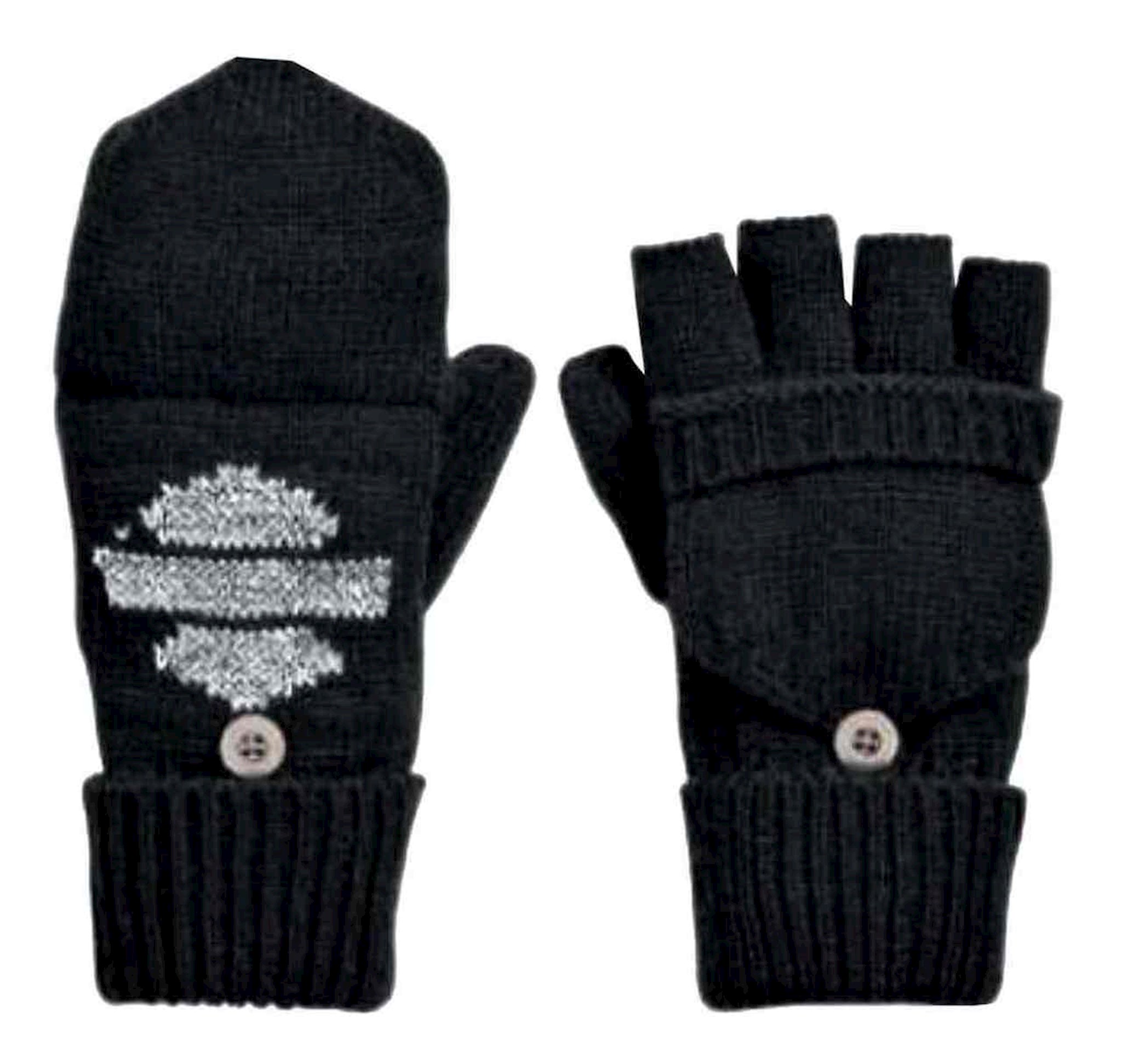 Harley-Davidson® Women's Metallic Logo Convertible Mittens, 97833-16VW. Made of 100% acrylic. Flip-top mitten design converts to finger-less gloves. Knit-in metallic graphics.