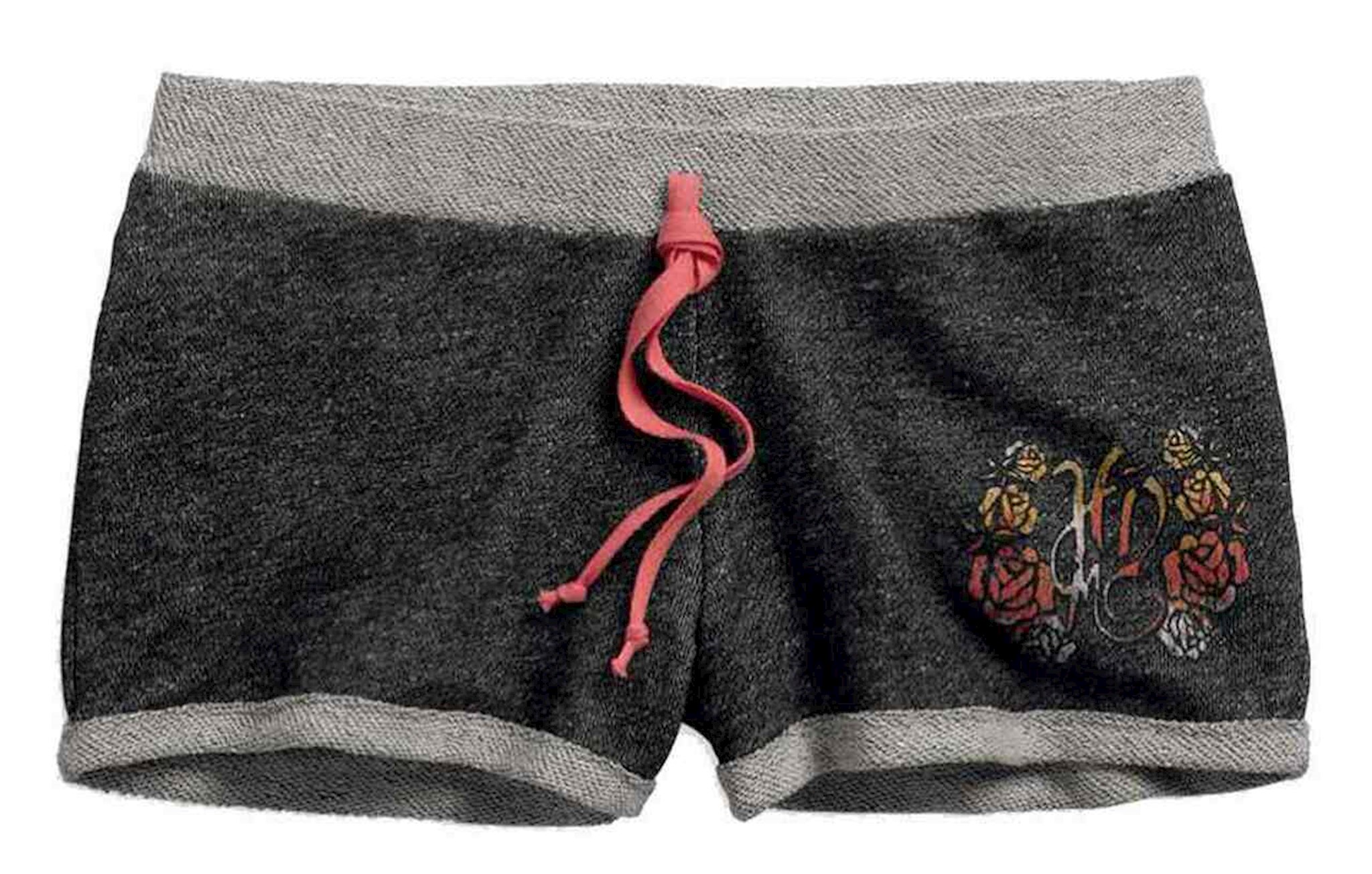 Harley-Davidson® Women's French Terry Sleep Shorts, 97892-16VW. Made of 60% cotton, 40% polyester two-tone French terry. Elastic waistband with decorative drawstring. Reversed French Terry cuffs and waist. Printed graphics on left hip. Super cute finishing details with the contrasting cuffs and waistband.