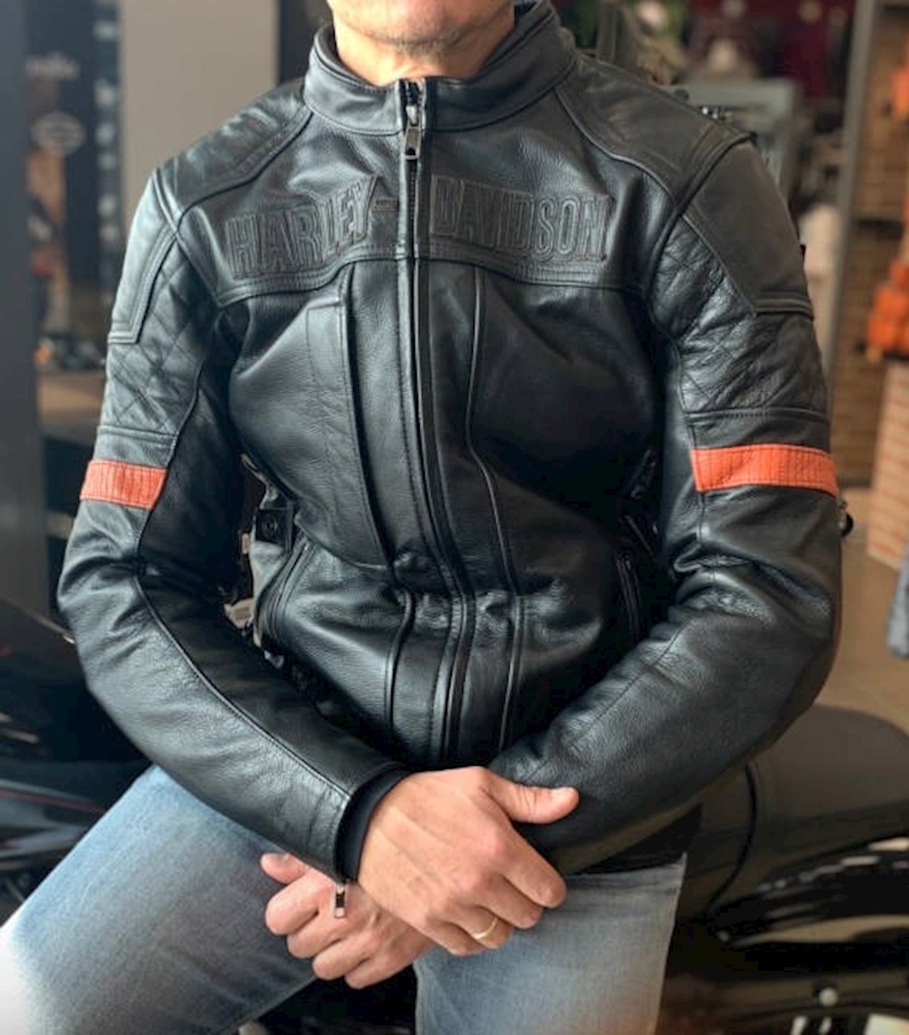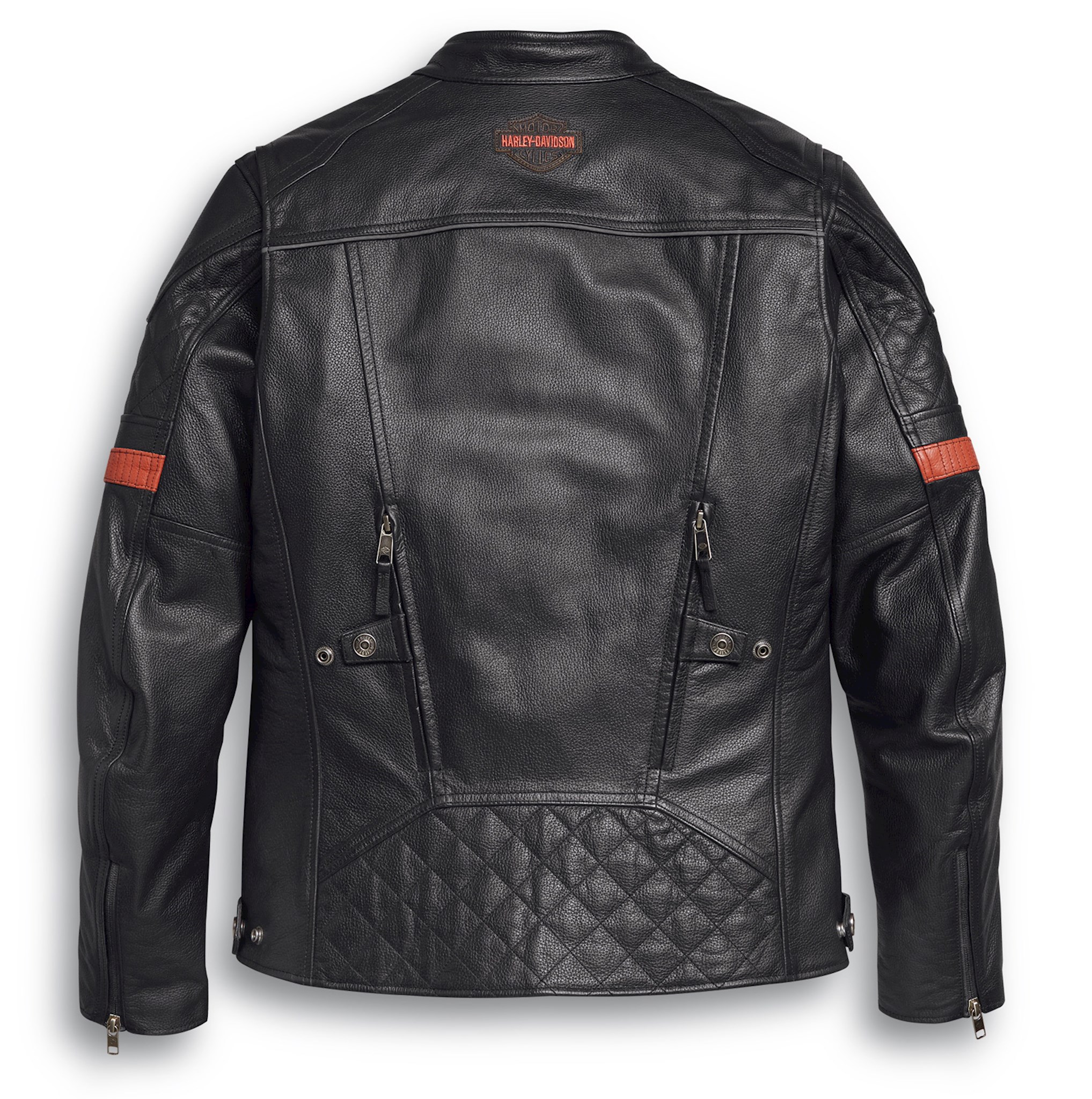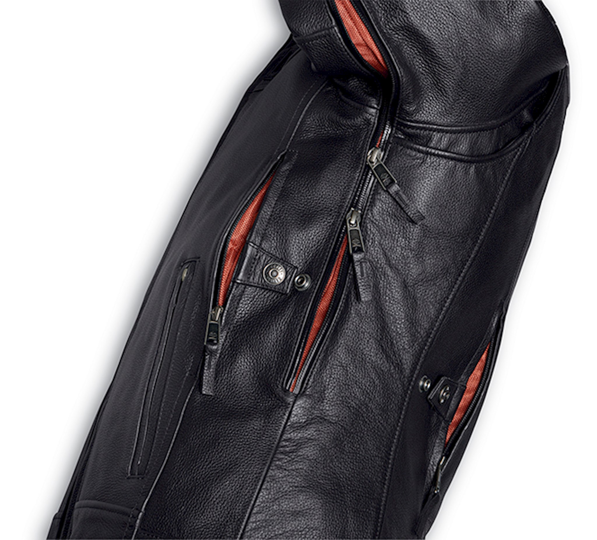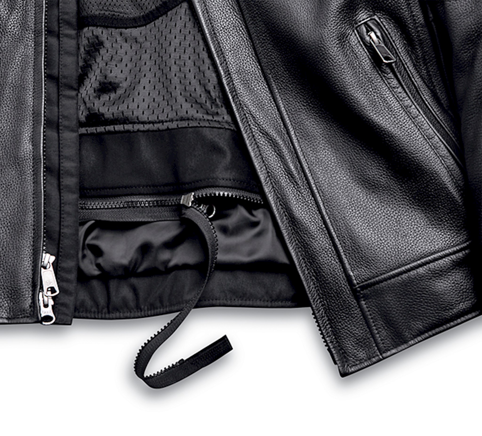 Engineered for diehard touring enthusiasts, the Vanocker Waterproof H-D® Triple Vent System Leather Jacket endures a variety of forecasts to keep you comfortable as every mile rolls by. The list of well-appointed features is long starting with climate control: an insulated liner bars chill and patented tri-vents offer customized cooling when you reach a comfortable temp. This men's leather motorcycle jacket offers an interior zipper compatible with any of our riding pants designed with a jacket-to-pant zipper. Pair them and the result is a full suit of coverage against cold and precipitation. Stay Comfortable: Patented Triple Vent System for customized cooling. Stay Dry: Removable nylon full-sleeve quilted warmth liner with 3M Thinsulate Insulation includes one interior stash pocket and one interior zipper pocket. Waterproof, breathable membrane. Seam sealed. Interior storm flap. Waterproof zippers. Fit & Mobility: Action back. Pre-curved sleeves. Snap waist tabs. Jacket-to-pant zipper helps prevent jacket from riding up and connects to any Harley-Davidson® riding pant with a jacket-to-pant zipper. Body armor included at elbows and shoulders Back body armor pocket fits lightweight Daniese Pro-Armor back body armor (98317-19VR, sold separately). Padded back waist and shoulders. Mandarin collar. Two-way zipper front with interior storm flap. Zipper cuffs. 3M Scotchlite Reflective Material piping. Pockets: Zipper hand-warmer and chest pockets. One interior stash pocket and one interior zipper pocket. Design Details: Contrasting cowhide stripes. Embroidered appliqué graphics. Materials: Heavyweight waterproof cowhide leather. Polyester mesh lining. EN-17092-4 certified