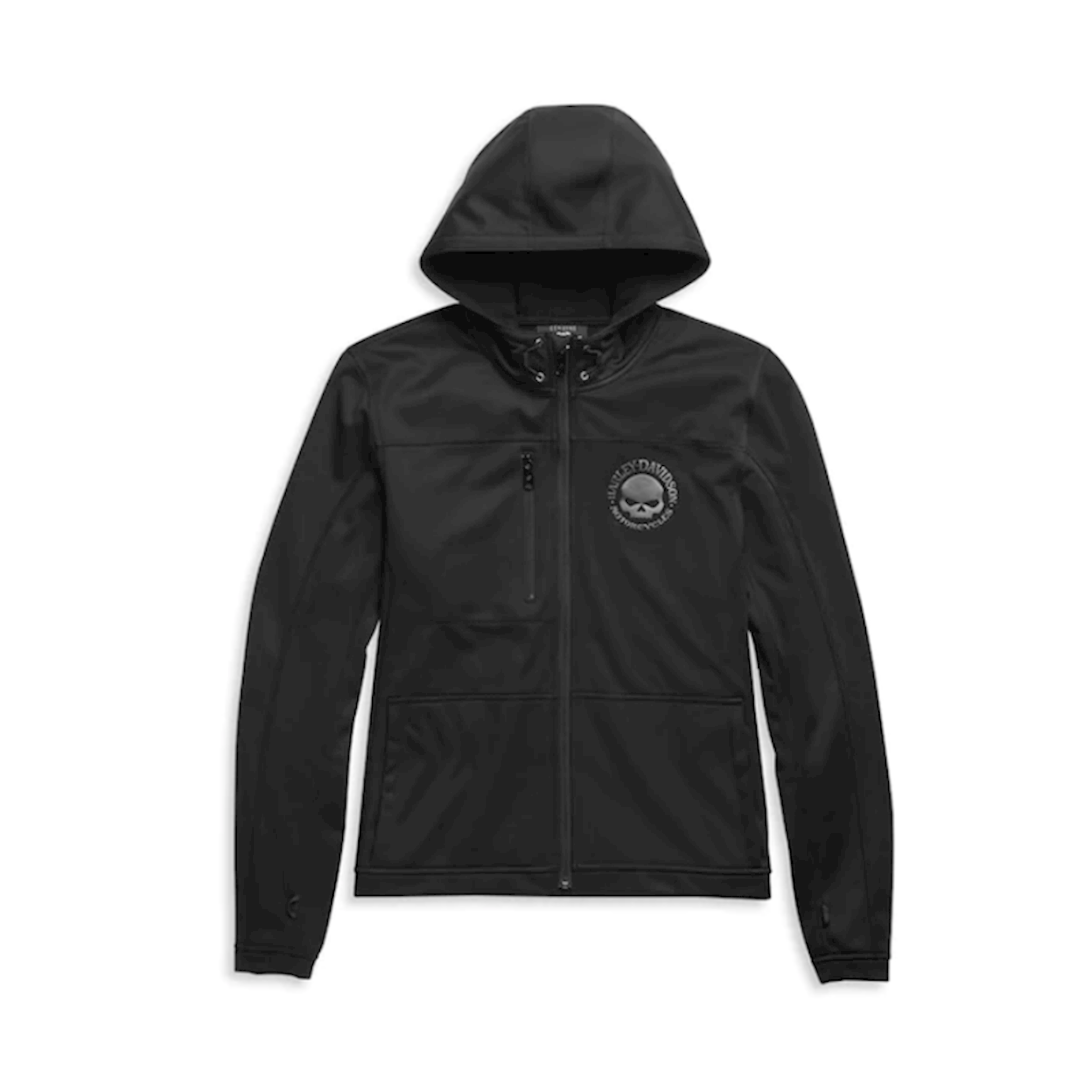 Stay Warm: Removable Windproof Fleece Hoodie. • Stay Cool: Shoulder and exit vents. • Fit & Mobility: Action Back. Hip release zipper. • Ride Enhancing Features: 3M Reflectivity. Back body armor pocket. Armor included at Shoulder and elbow. Back body armor pocket. • Pockets: Zipper chest POCKETS. Zipper handwarmer POCKETS. Vertical interior pocket. • Materials: Midweight Cowhide. 100% Polyester Windproof Fleece. • Design Details: Emboss, Reflective Applique.