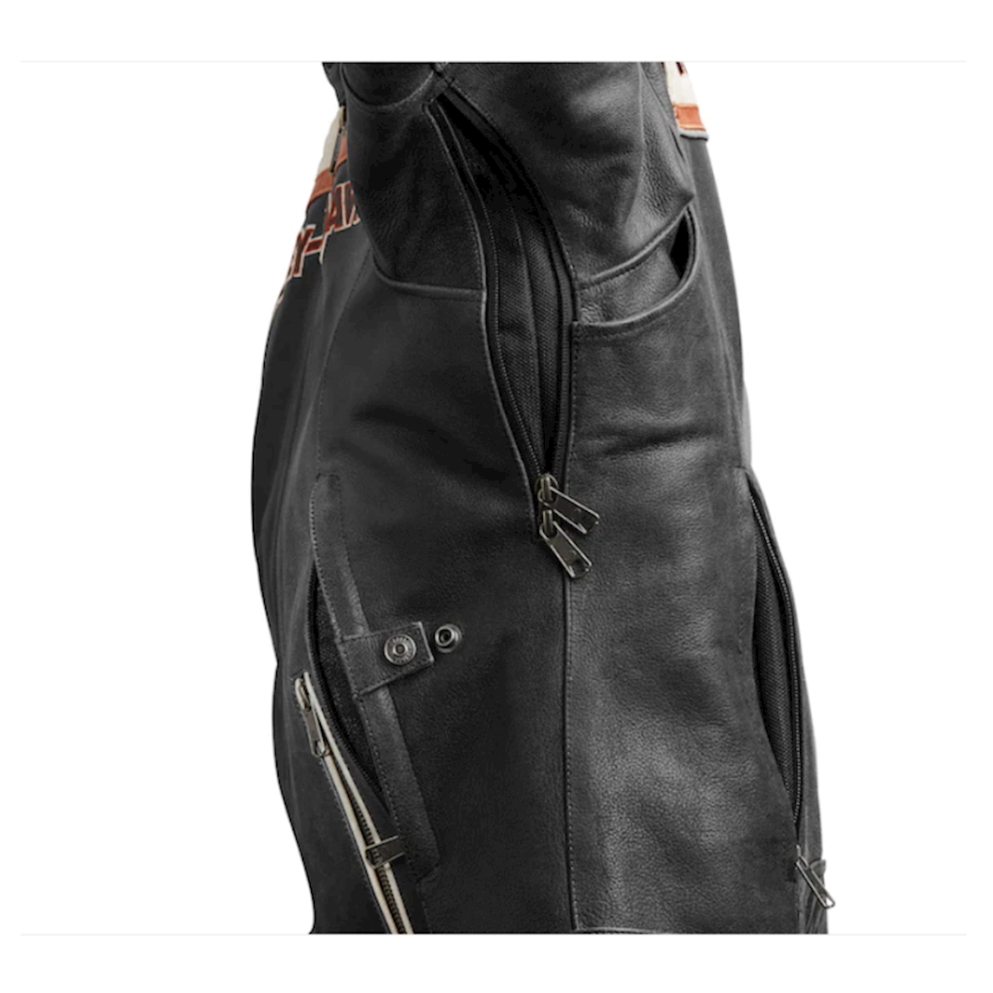 Stay Cool: Triple Vent Technology. • Fit & Mobility: Comfort Action Back for Mobility. • Ride Enhancing Features: Jacket to pant connection option. 3M Reflectivity. Armor Pockets. • Pockets: Zipper handwarmer pockets. Vertical interior pocket. • Materials: Heavyweight Distressed Cowhide. • Graphics: Applique.