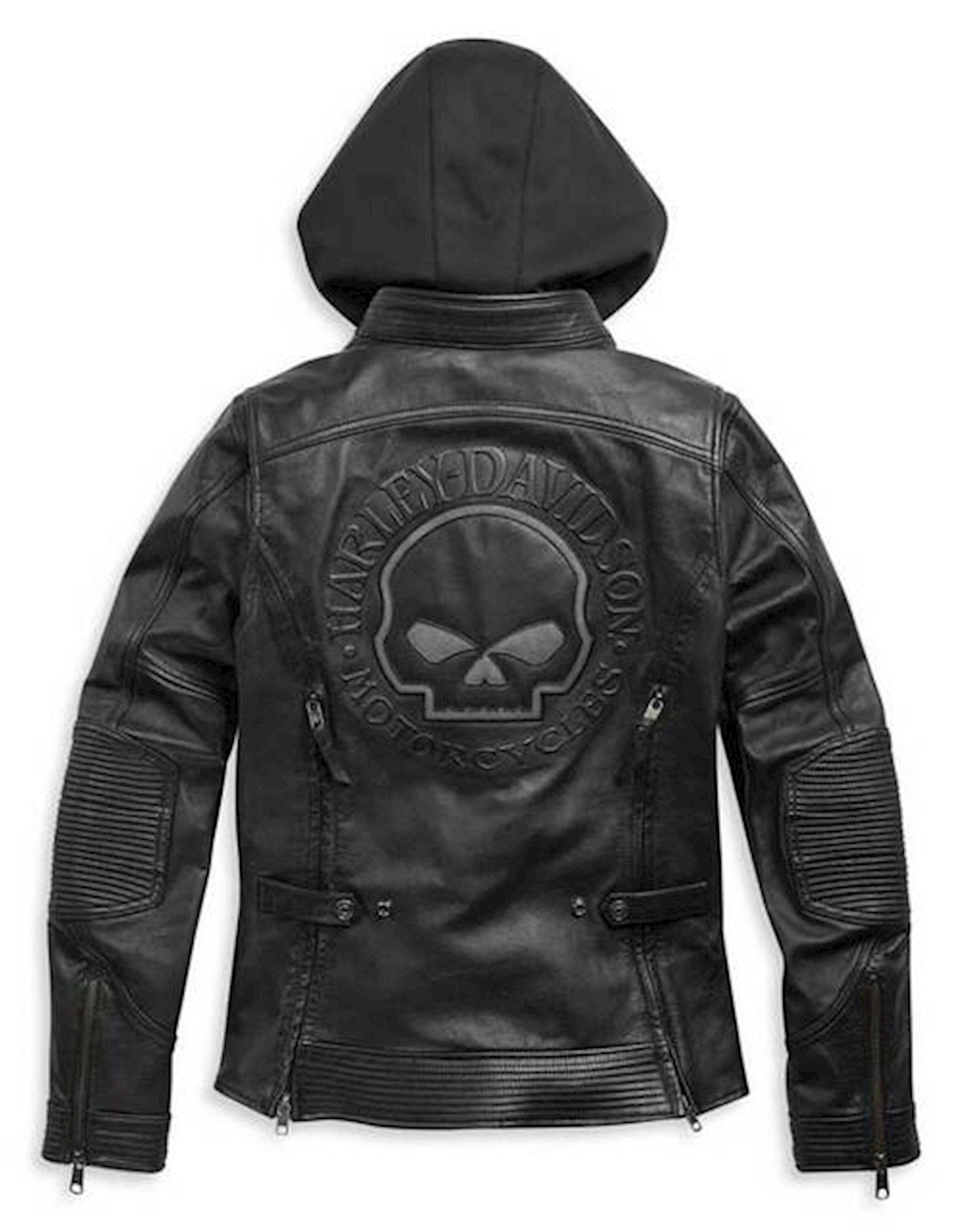 Harley-Davidson® Women's Auroral II 3-IN-1 Leather Jacket - Black, 98011-21VW. Stay-warm removable windproof fleece and stay-cool vents to an action back and body armor pockets. Equipped with plenty of zippered pockets to secure your belongings. Action back for perfect mobility. Hip release zipper. 3M™ Scotchlite™ Reflective Material. Back body armor pocket. Armor included at Shoulder and elbow. Back body armor pocket. Zipper hand-warmer pockets. Vertical interior pocket. Constructed from midweight cowhide leather. Removable hoodie is made from 100% polyester windproof fleece. Embossed and reflective applique graphics.