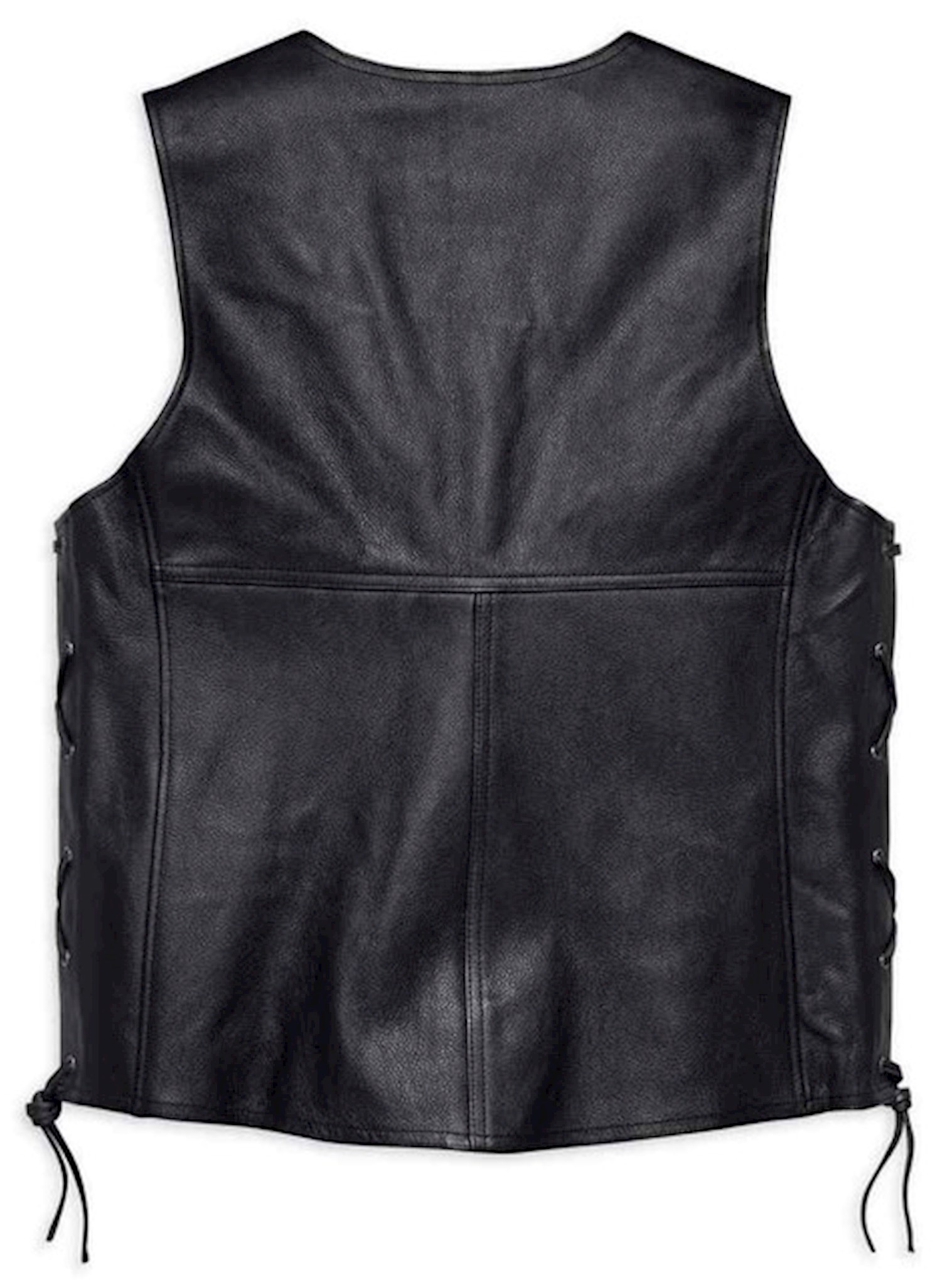 Harley-Davidson® Men's Tradition II Leather Vest. The classically styled Tradition II Leather Vest keeps it simple so you can make it your own with patches, pins, and more. Cut from hard-wearing cowhide, this men's leather vest includes adjustable lacing for a custom fit.
