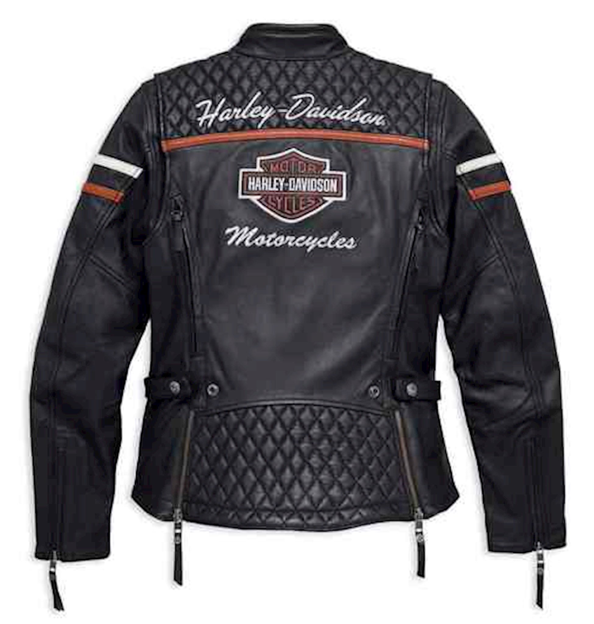 The original Harley-Davidson women's leather jacket Miss Enthusiast CE offers plenty of freedom of movement on the back. Preformed sleeves. Waist straps with snap fasteners. Two hip zippers. Loose fit thanks to Classic Fit for more comfort and a more comfortable fit. Removable protectors on elbows and shoulders, certified according to EN 1621-1 CE. With back protector pocket for CE Level 1 back protector (98150-17VR, sold separately). Two-way zipper on the front. Zippered cuffs. Padded back waist, shoulders and yoke. Zip hand warmer pockets. An inside pocket with a vertical zip. Pieces of leather and embroidered graphics Medium-weight, abrasion-resistant cowhide. Polyester mesh lining. Meets or exceeds the CE requirements for personal protective clothing in terms of abrasion resistance, impact testing and seam strength.
