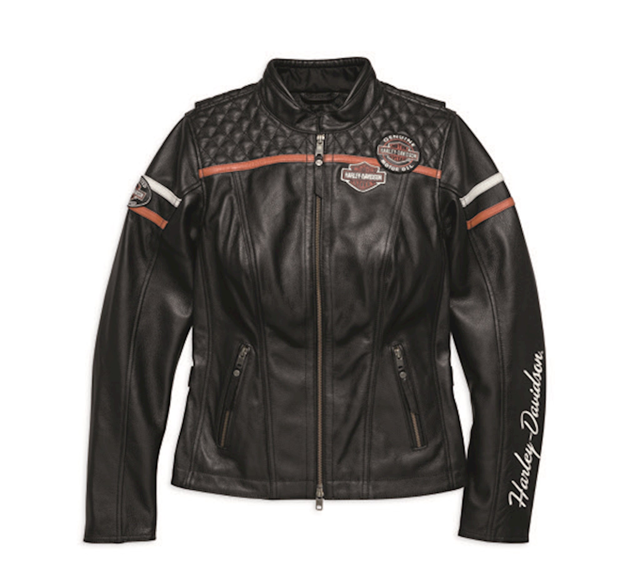 The original Harley-Davidson women's leather jacket Miss Enthusiast CE offers plenty of freedom of movement on the back. Preformed sleeves. Waist straps with snap fasteners. Two hip zippers. Loose fit thanks to Classic Fit for more comfort and a more comfortable fit. Removable protectors on elbows and shoulders, certified according to EN 1621-1 CE. With back protector pocket for CE Level 1 back protector (98150-17VR, sold separately). Two-way zipper on the front. Zippered cuffs. Padded back waist, shoulders and yoke. Zip hand warmer pockets. An inside pocket with a vertical zip. Pieces of leather and embroidered graphics Medium-weight, abrasion-resistant cowhide. Polyester mesh lining. Meets or exceeds the CE requirements for personal protective clothing in terms of abrasion resistance, impact testing and seam strength.