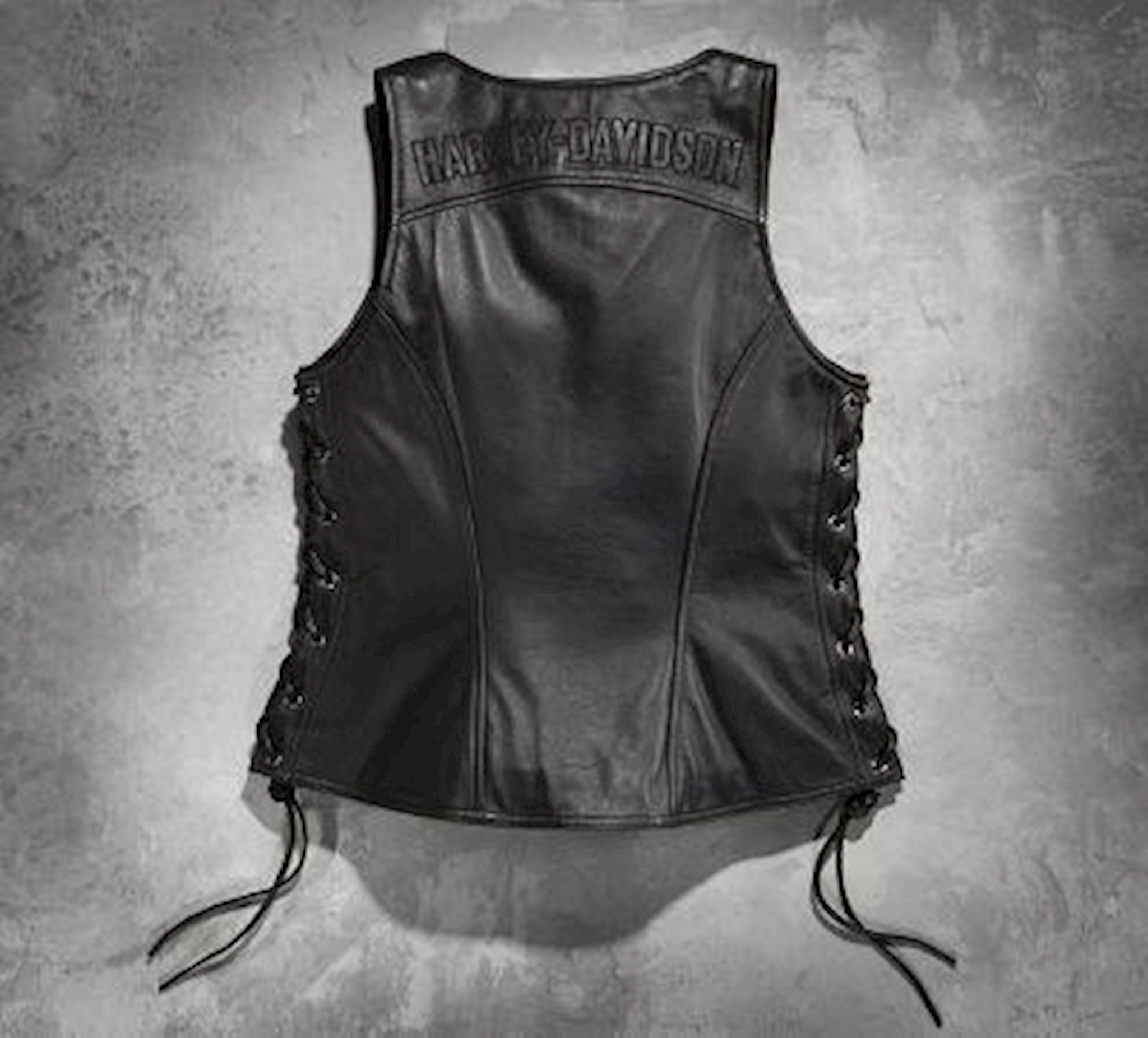 Harley-Davidson® Women's Avenue Leather Vest Side Lacing, Black 98071-14VW. The Avenue Leather Vest features sexy side-lacing and a racy silhouette that will leave 'em speechless. Midweight genuine leather shell. 2-way zipper front. 2 zippered hand-warmer pockets. Side lacing detail. Metal badge on front right hem. Embroidered graphics on back yoke.
