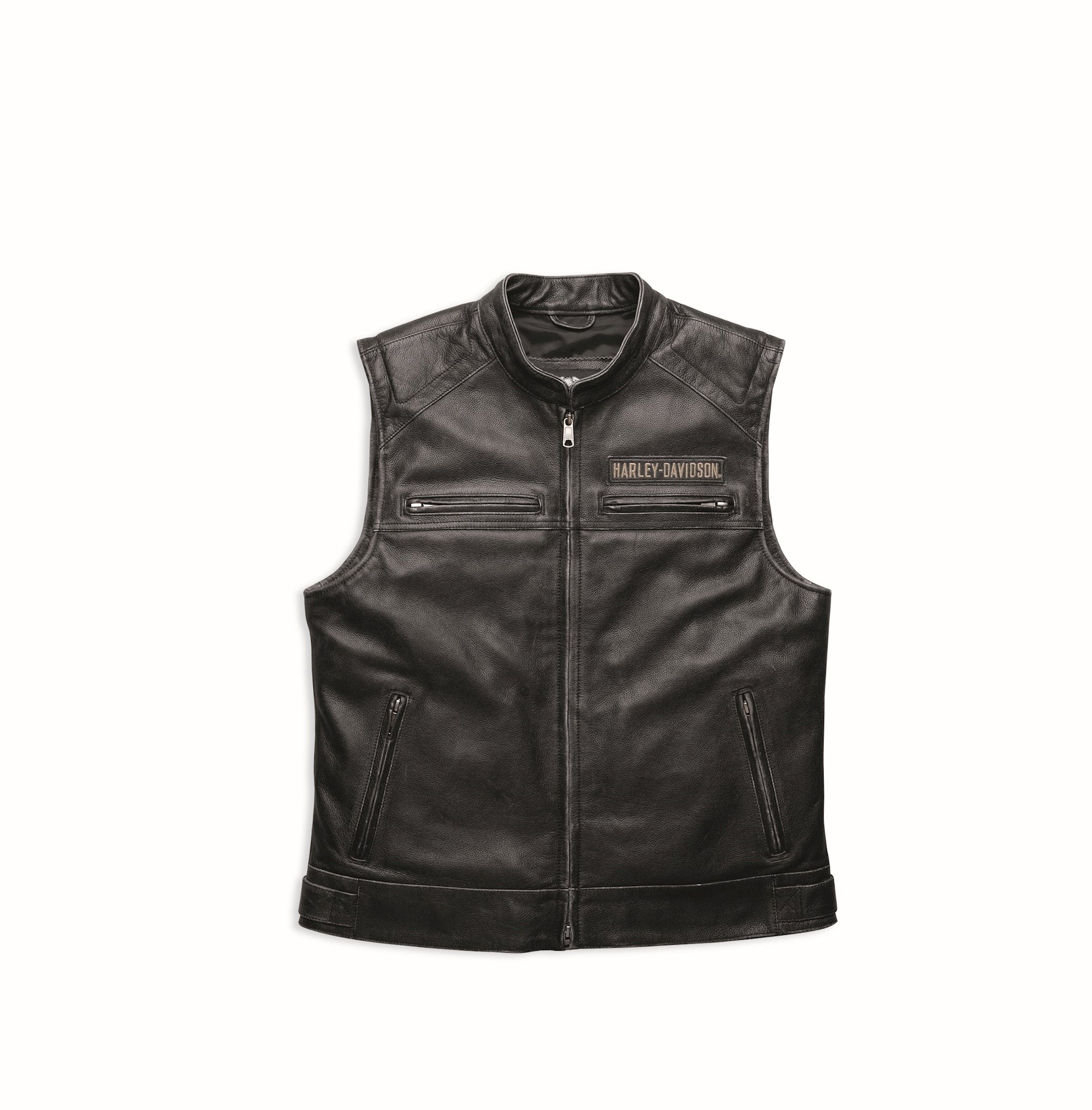Harley-Davidson® Men's Passing Link Leather Vest, 98109-16VM. Midweight distressed cowhide leather. Polyester taffeta lining. Lightly padded back waist and shoulders. Snap waist tabs. Two zipper hand-warmer pockets. Two zipper chest pockets. One horizontal interior pocket and one zipper vertical interior pocket with media port. Embroidered leather patch on left chest. Oiled and dirtied embroidered graphics on front and back. Cowhide leather inlay graphics on back.