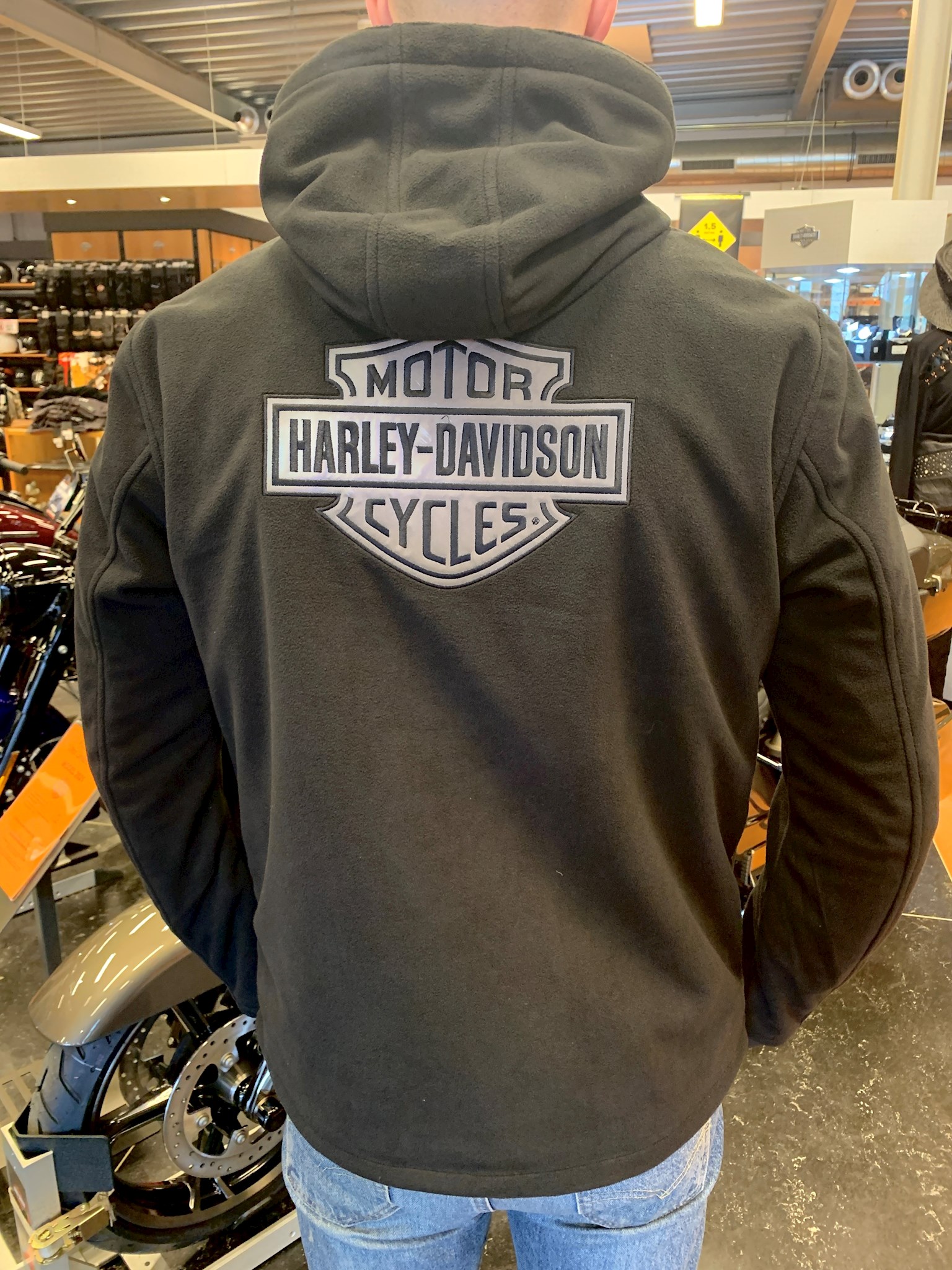 Don’t let weather get in the way of your next ride—stay warm, dry, and visible with this waterproof fleece jacket. It’s loaded with sensible features like stretch fleece, body armor pockets, and reflective material. Also has a secure interior pocket with a rubber media port. Finished with our Bar & Shield logo on back as a reflective appliqué for added texture and visibility.