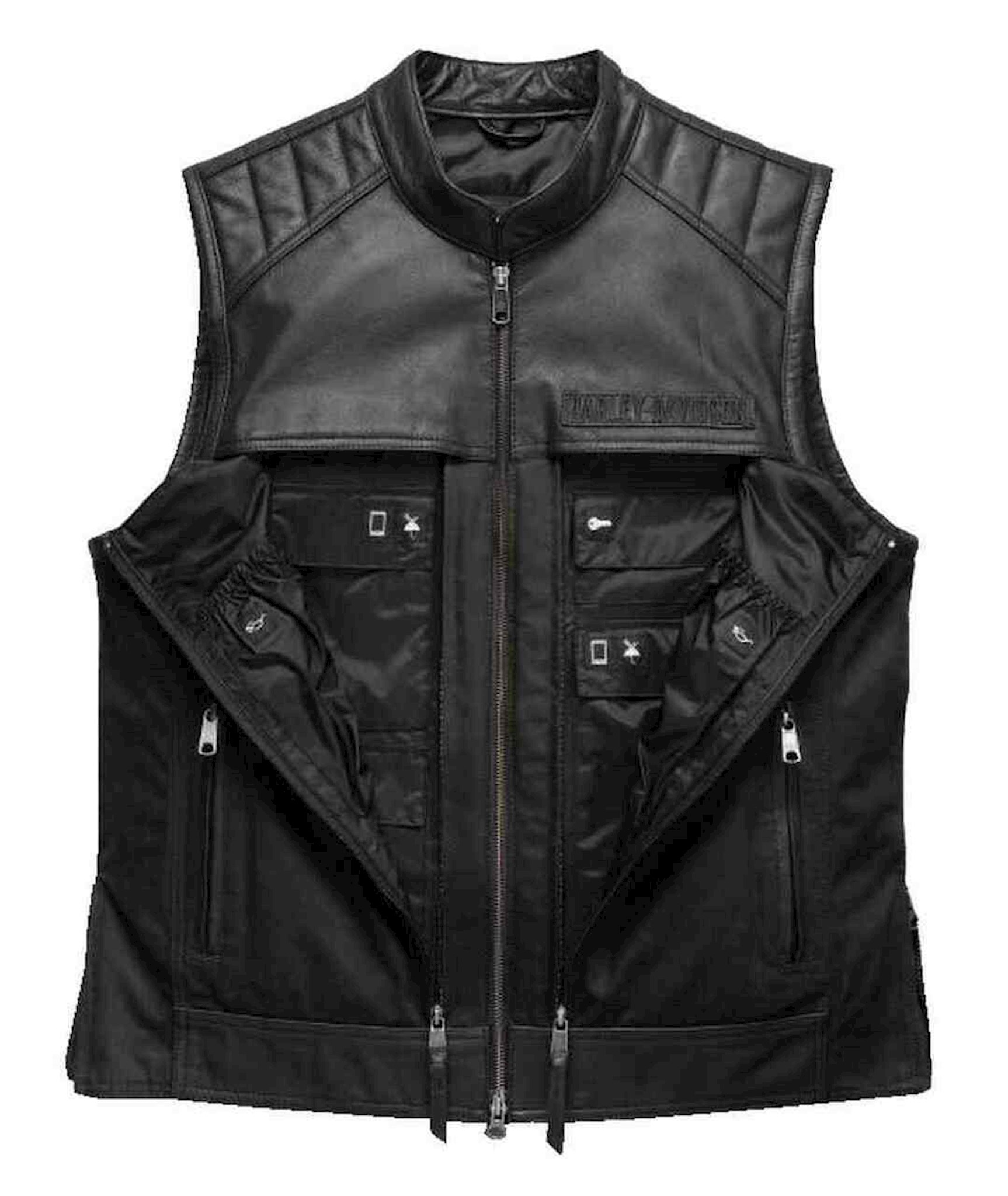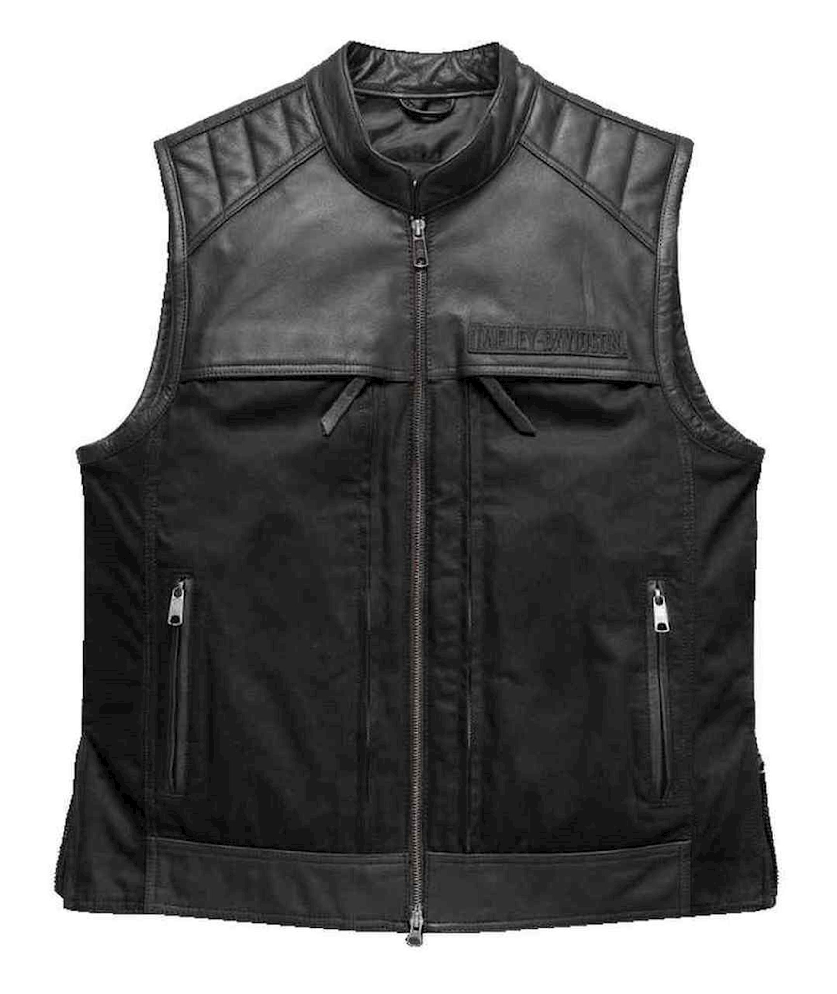 Harley-Davidson® Men's Synthesis Pocket System Leather/Textile Vest, 98120-17VM. Constructed from 100% cotton canvas body with buffalo leather front/back yokes, waist, and pocket trim. Polyester taffeta body lining. Lightly padded back waist and shoulders. Two side zipper gussets. Two zipper hand-warmer pockets and exterior pocket system with two large exterior pockets that unzip to reveal a total of six additional pockets, including two waterproof phone pockets. Interior pockets include two horizontal and two zipper vertical. Embroidered leather patch on left chest. This vest is fully loaded with pocket options, which is a huge plus since vests typically don't have enough. Unzip to reveal interior pockets as well. From keys to wallet, phone to gloves, your essentials stay in place. The combination leather/canvas construction shaves weight off this vest for easy going wear.