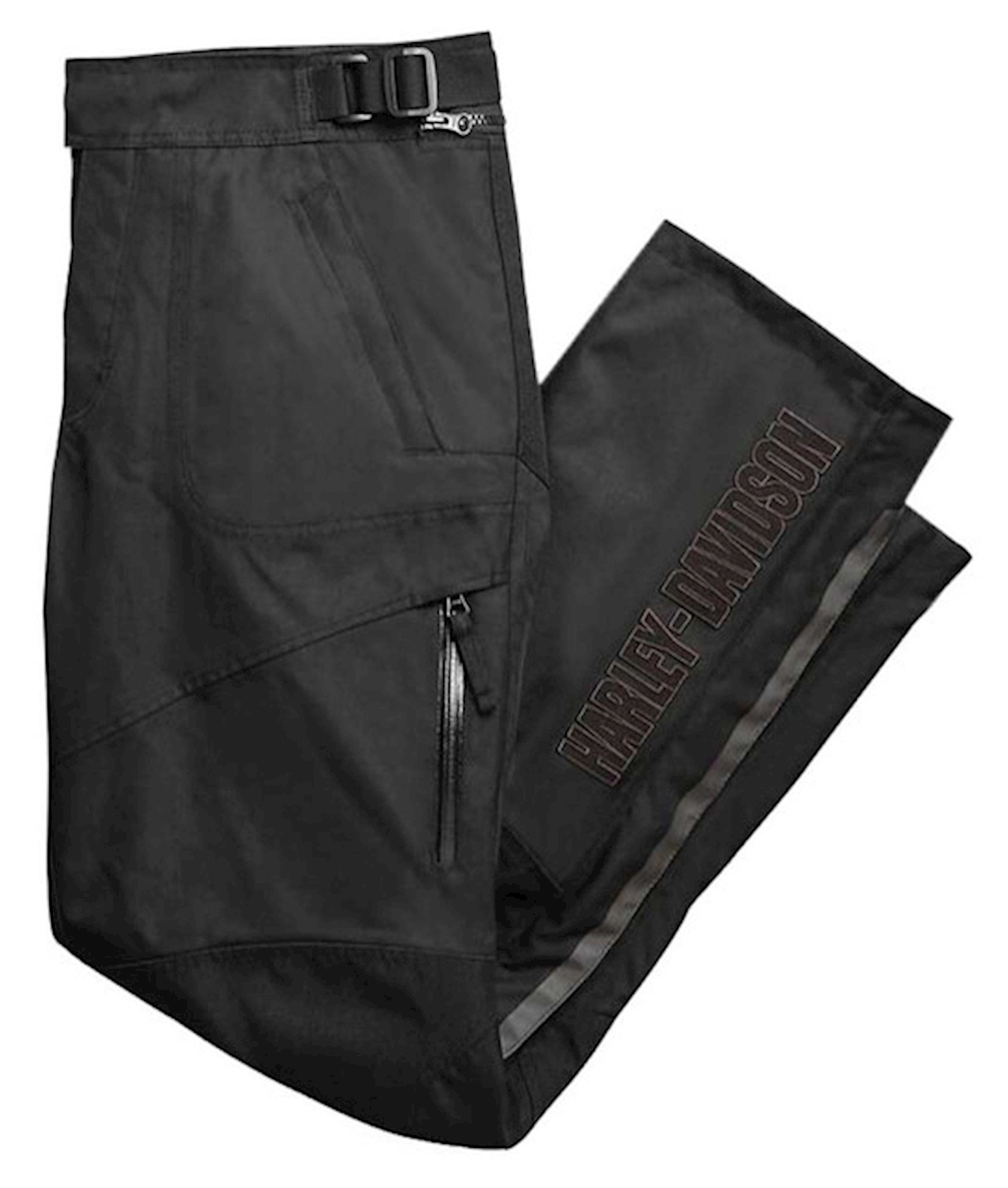 Harley-Davidson® Men's Vanocker Waterproof Overpant, 98127-20VM. Vanocker Waterproof Overpant helps you meet weather demands to stay comfortable and still enjoy the view. Functional design includes venting to keep you cool when you reach a comfortable temp, armor pockets for enhanced ride, reflective to make your road presence known. These men's motorcycle pants zip to any of our jackets designed with a jacket-to-pant zipper. Pair them and the result is a full suit of coverage against cold and precipitation. Thigh vents for cooling airflow. Waterproof, breathable construction. Seam sealed. Waterproof zippers. Buckle waist tabs. Jacket-to-pant zipper helps prevent jacket from riding up and connects to any Harley-Davidson® jacket with a jacket-to-pant zipper. Knee articulation. Body armor pockets at knees and hips fit lightweight body armor (98071-05VR, sold separately). Heat shields on lower legs. Reinforced seat and knees. Snap-tab closure with zipper and full gusset at fly. Zipper legs with adjustable ankle tab. 3M™ Scotchlite™ Reflective Material stripes. Zipper hip pockets. Embroidered appliqué graphics. Waterproof 600 denier 100% polyester canvas. Polyester mesh lining. Sized to fit over jeans—do not size up.