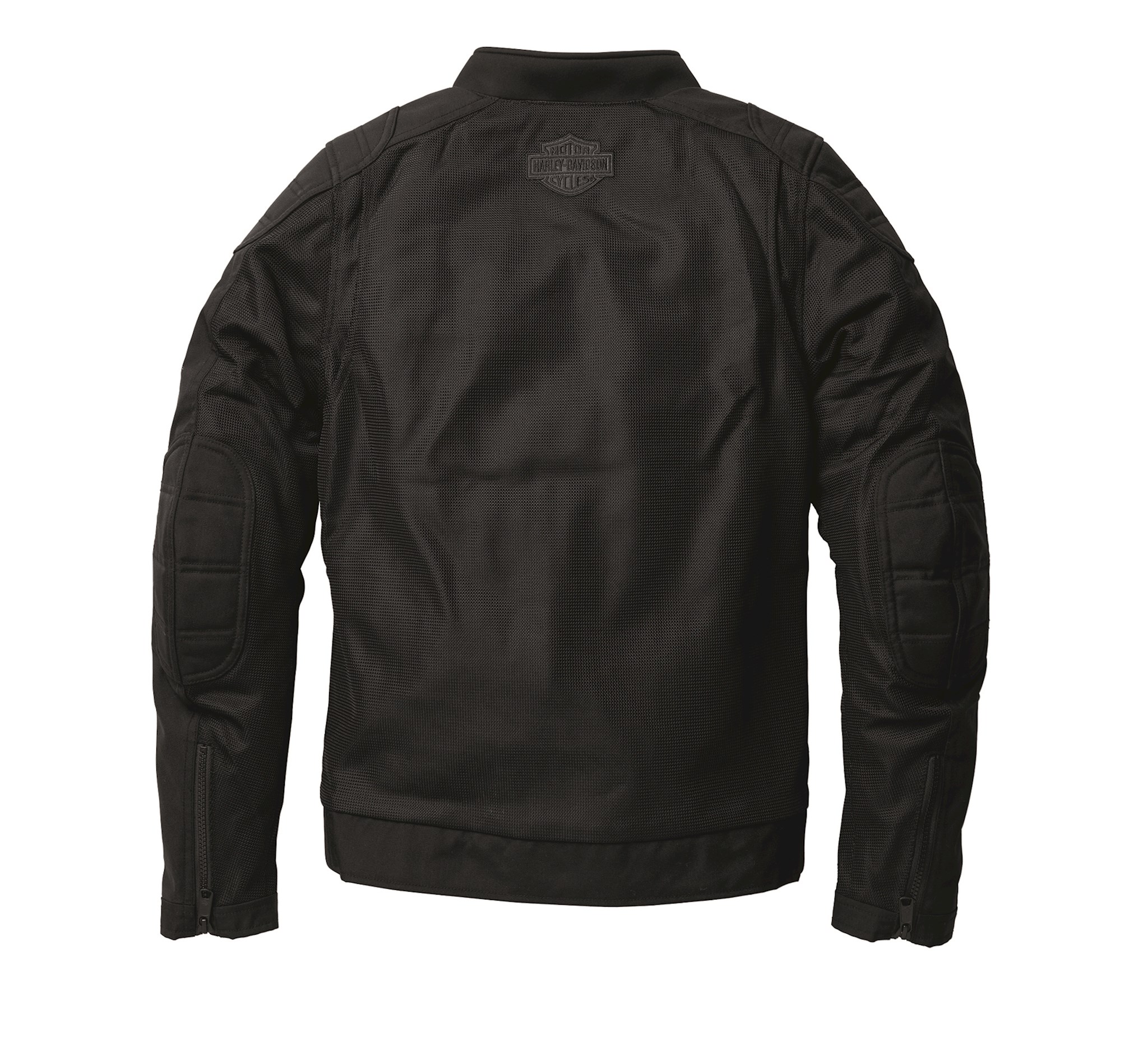 Harley-Davidson women's textile summer jacket - ref. 98180-22EW Hard knit 100% polyester. 100% polyester mesh lining. Detachable zipped windproof liner. Pre-curved sleeves. Stretch side panels. Officer collar. Adjustable zipped cuffs. Two-way zip closure. Two zippered handwarmer pockets. Cargo chest pockets. One inside pocket. Protections on elbows and shoulders. Slot for back protector (ref. 98105-22VR sold separately). 3M reflective piping. Embroidered Harley-Davidson® graphic on left chest and Bar & Shield® on upper reflective back.
